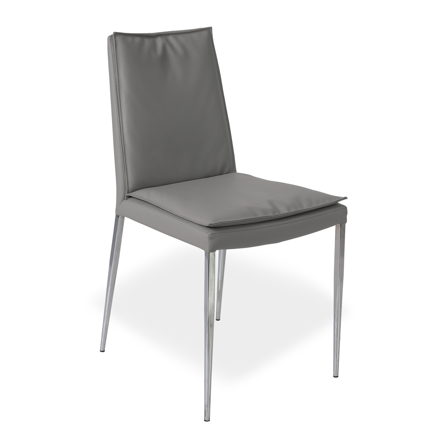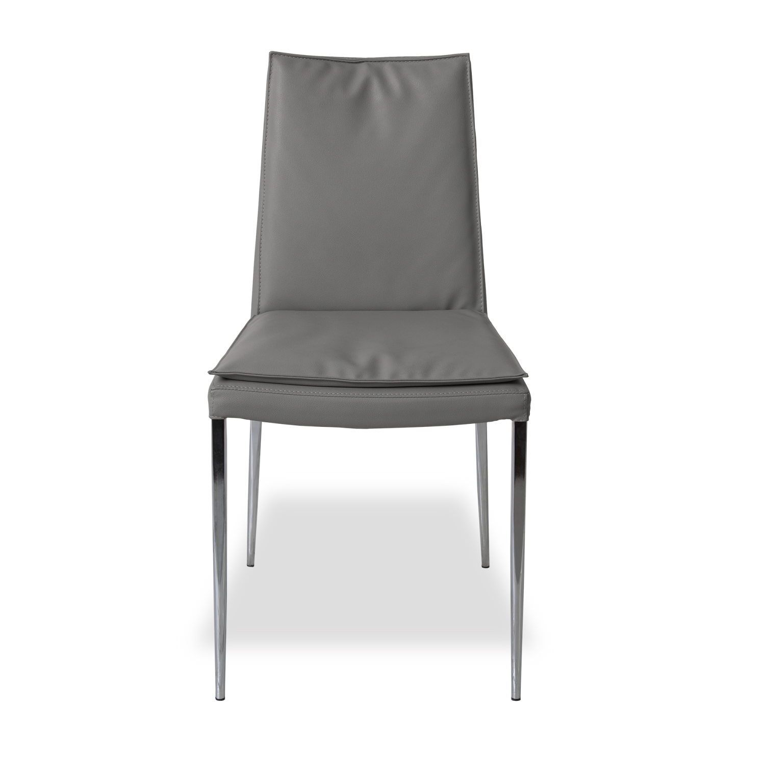 [0] => The Mina Dining Chair, available with polished steel legs, features light grey ecopelle upholstery and tapered legs. This soft minimalist chair is punctuated by a two-layered cushioned seat and back, which provide extra comfort for any dining occasion.