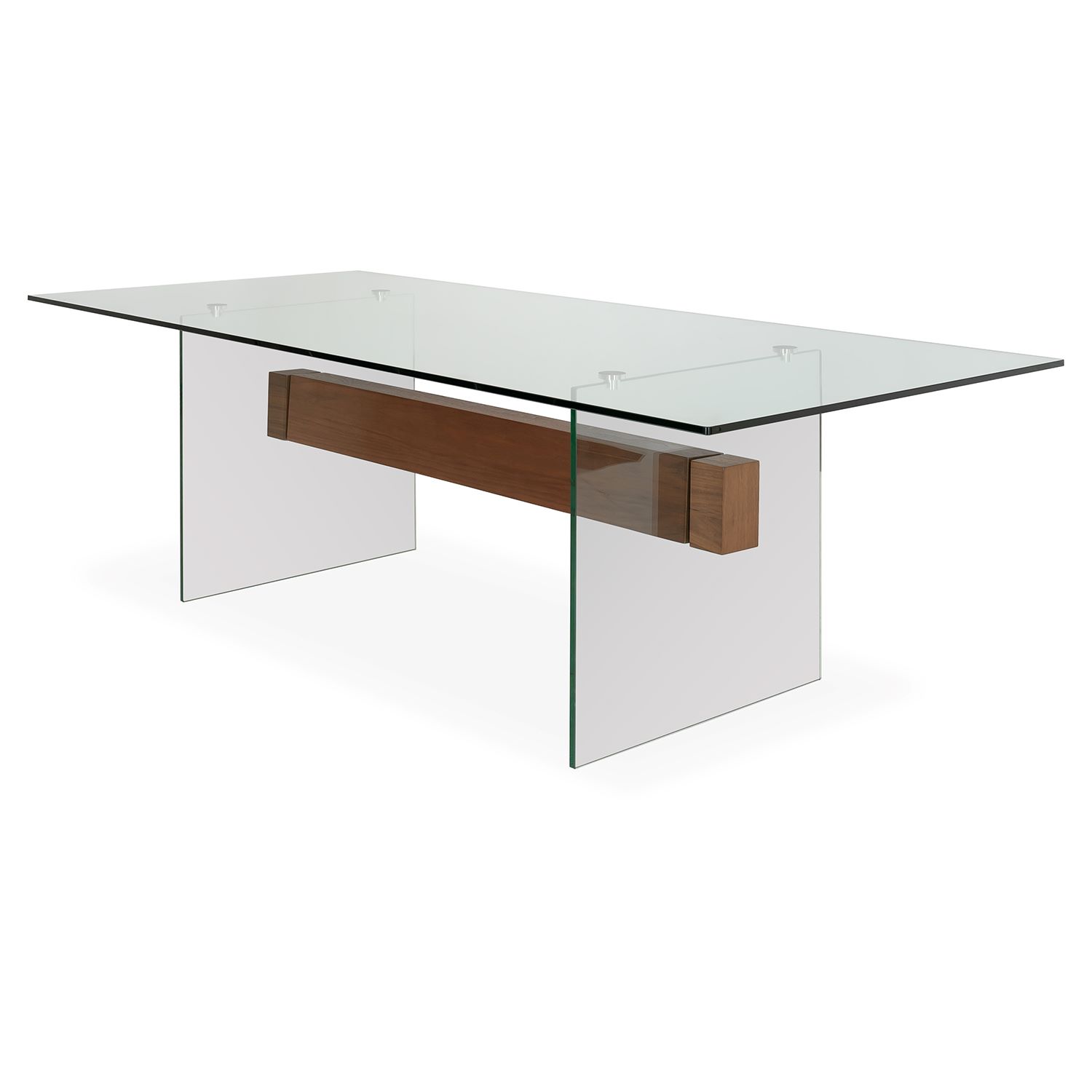 [0] => The Mirage Dining Table features a classic trestle design with a contemporary twist. The clear glass top and legs are stunning and sophisticated, complemented by polished metal accents. A walnut wood beam appears to extend through the glass legs, creating a floating, "mirage"-like effect, and demonstrating a daring blend of the traditional and new. Mirage's simple yet stylish design means that it can easily integrate into a variety of design environments.