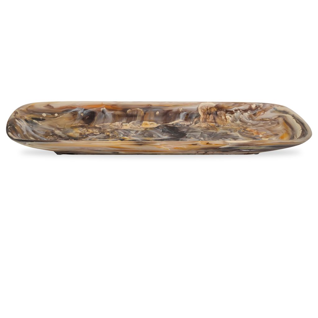 The Mocha Swirl Rectangle Platter brings you a splash of style with its rounded rectangular shape and stunning swirl pattern in brown, cream, orange, and grey. This platter is suitable for serving cold and room-temperature foods such as fruits, snacks, or candies. It can also be used to display decor, or as a functional container to place mail or keys. Designed in Australia, the Mocha Swirl Rectangle Platter is made of shatter-resistant resin and no two are exactly alike.