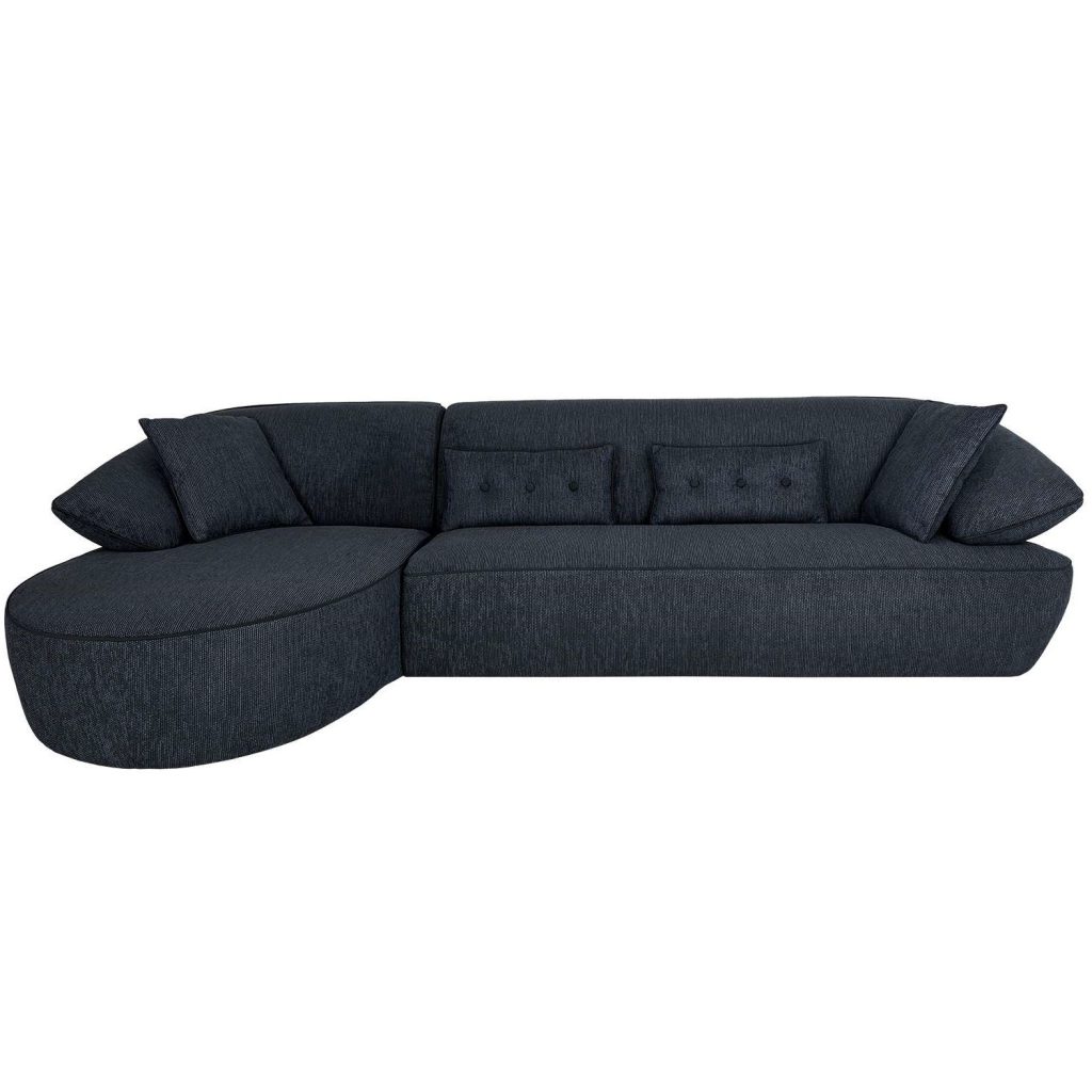 Enhance your comfort with the Momo sectional, which sports a contemporary, organic design suitable for any modern living space. Made in Italy, Momo features curved lines, winged armrests, and a rounded left-facing chaise, all of which contribute to a cozy, enveloping feel. Textured, blue-grey fabric upholstery is accented by dark grey Lycra® piping that outlines Momo's profile for a tailored finish, and four included pillows offer additional support. With its rounded design and inviting look, Momo effortlessly combines timeless elegance with modern comfort.