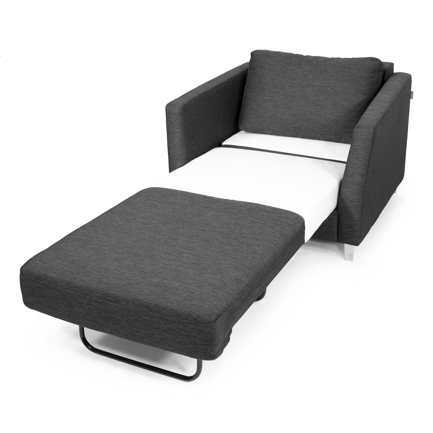 The Monika chair sleeper, available in loule fabric with metal legs, is designed to help you save space without sacrificing style. The Monika folds out into a sleeper that can comfortably accommodate one adult.