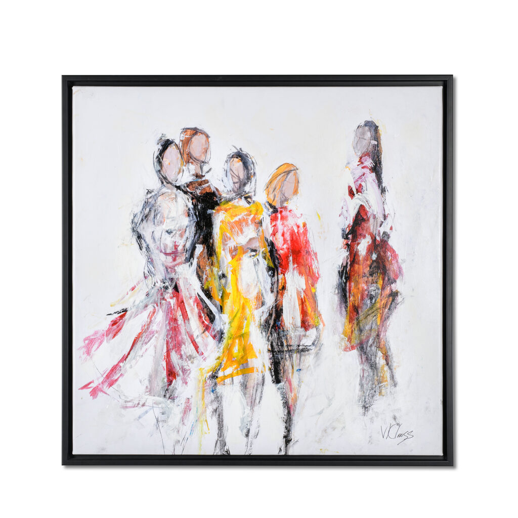 [0] => The Monsaraz Wall Art depicts the abstract shapes of five women against an off-grey background. Bold oranges, yellows, and reds create their colorful hair and clothes, while subtle black shadows add dimension. At once fashionable and whimsical, this artwork will bring a touch of color into your living space. Artwork on canvas by V. Klauss with a black floater frame.