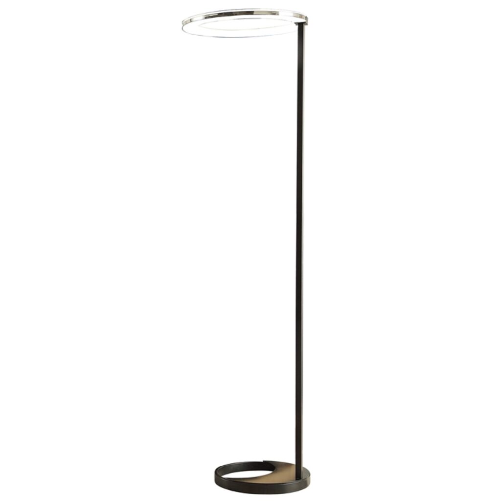[0] => The Moon Floor Lamp has a sleek, minimalist design, with a striking acrylic black matte structure. The thin rectangular pole connects both circular ends, one where light shines down, and the other shapes into a half-moon design. This piece has a open structure that looks balanced and is easy to fit into any home environment. The lamp has a color temperature of 6000 - 6500K with a 19W LED light.