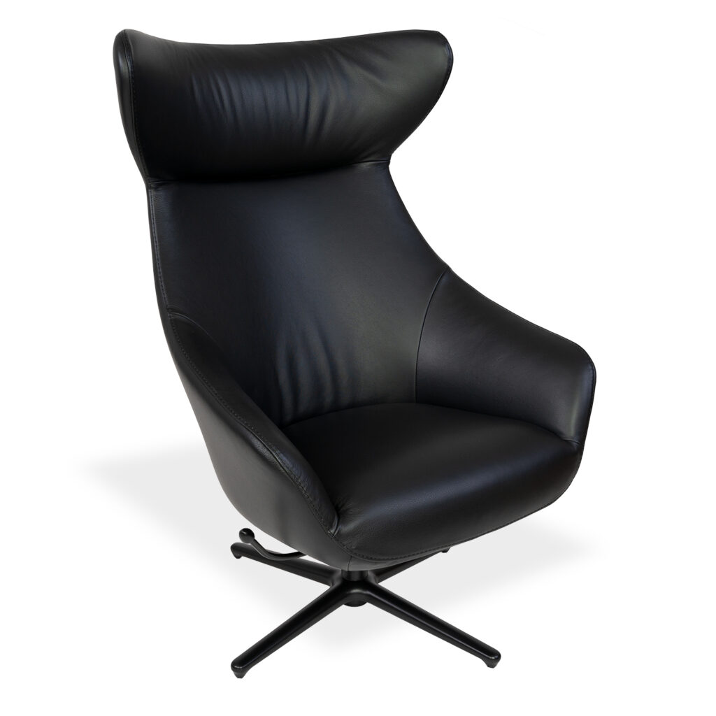 [0] => Add instant flair to your living room, bedroom, or office with the Moreno Swivel Chair. Upholstered in Klimt black leather, Moreno features a striking winged headrest and a star base made of matte black metal. With 360-degree swivel capability and a side lever that lets you enable or disable the recline function, Moreno unites comfort, flexibility, and style in one sleek package. Pair with the Moreno Ottoman to complete your setup.
