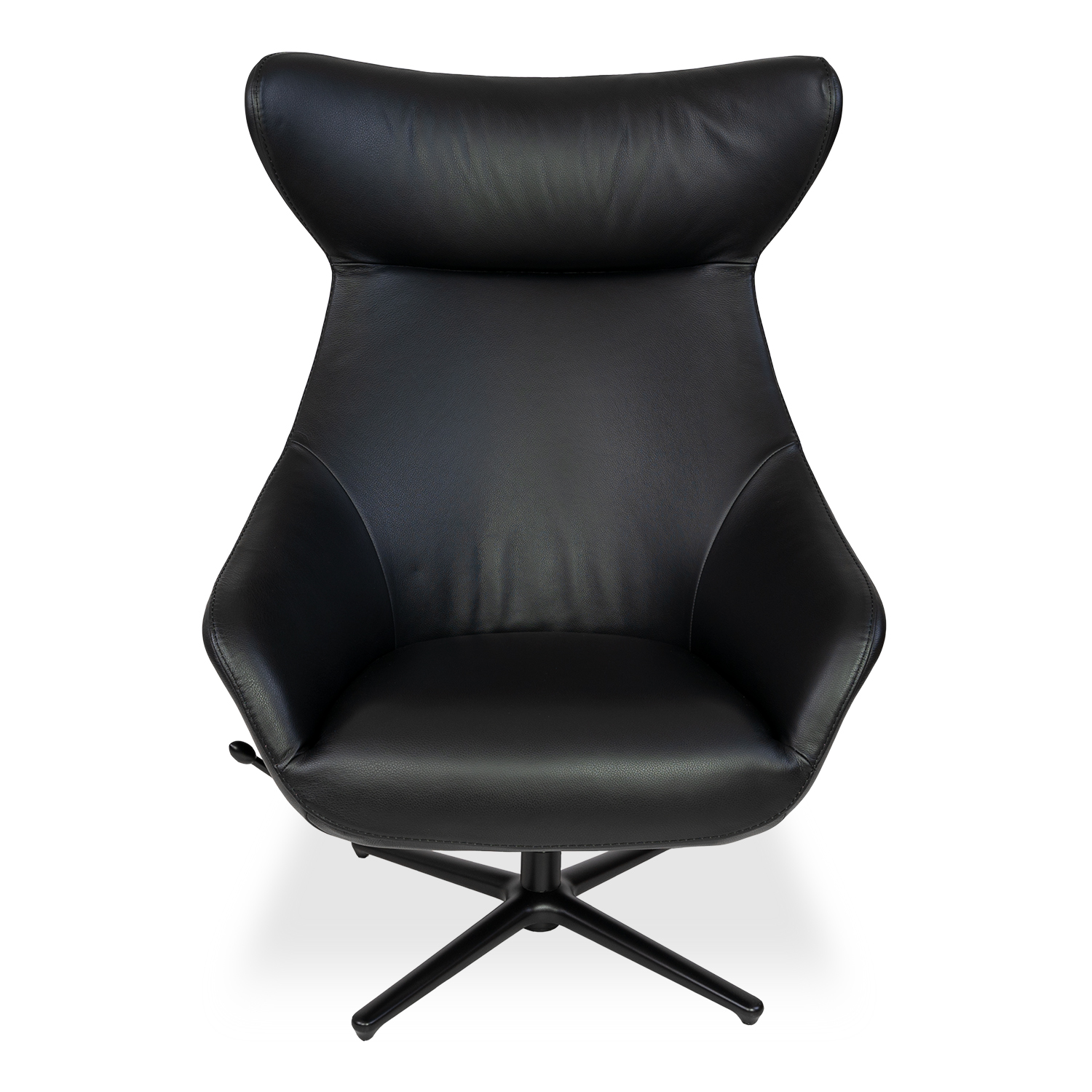 Add instant flair to your living room, bedroom, or office with the Moreno Swivel Chair. Upholstered in Klimt black leather, Moreno features a striking winged headrest and a star base made of matte black metal. With 360-degree swivel capability and a side lever that lets you enable or disable the recline function, Moreno unites comfort, flexibility, and style in one sleek package. Pair with the Moreno Ottoman to complete your setup.