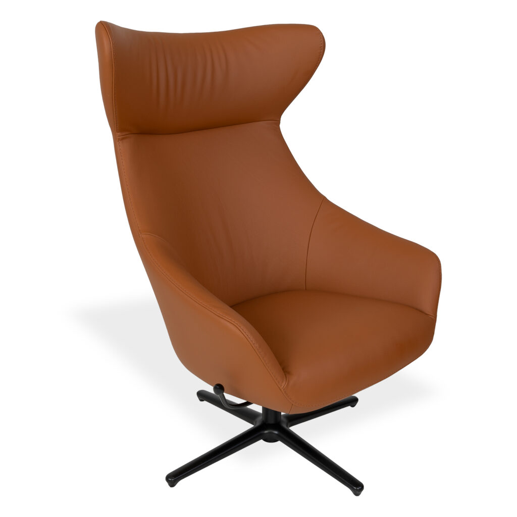 [0] => Add instant flair to your living room, bedroom, or office with the Moreno Swivel Chair. Upholstered with velvety-soft Boston leather in warm cognac brown, Moreno features a striking winged headrest and a star base made of matte black metal. With 360-degree swivel capability and a side lever that lets you enable or disable the recline function, Moreno unites comfort, flexibility, and style in one sleek package. Pair with the Moreno Ottoman to complete your setup.