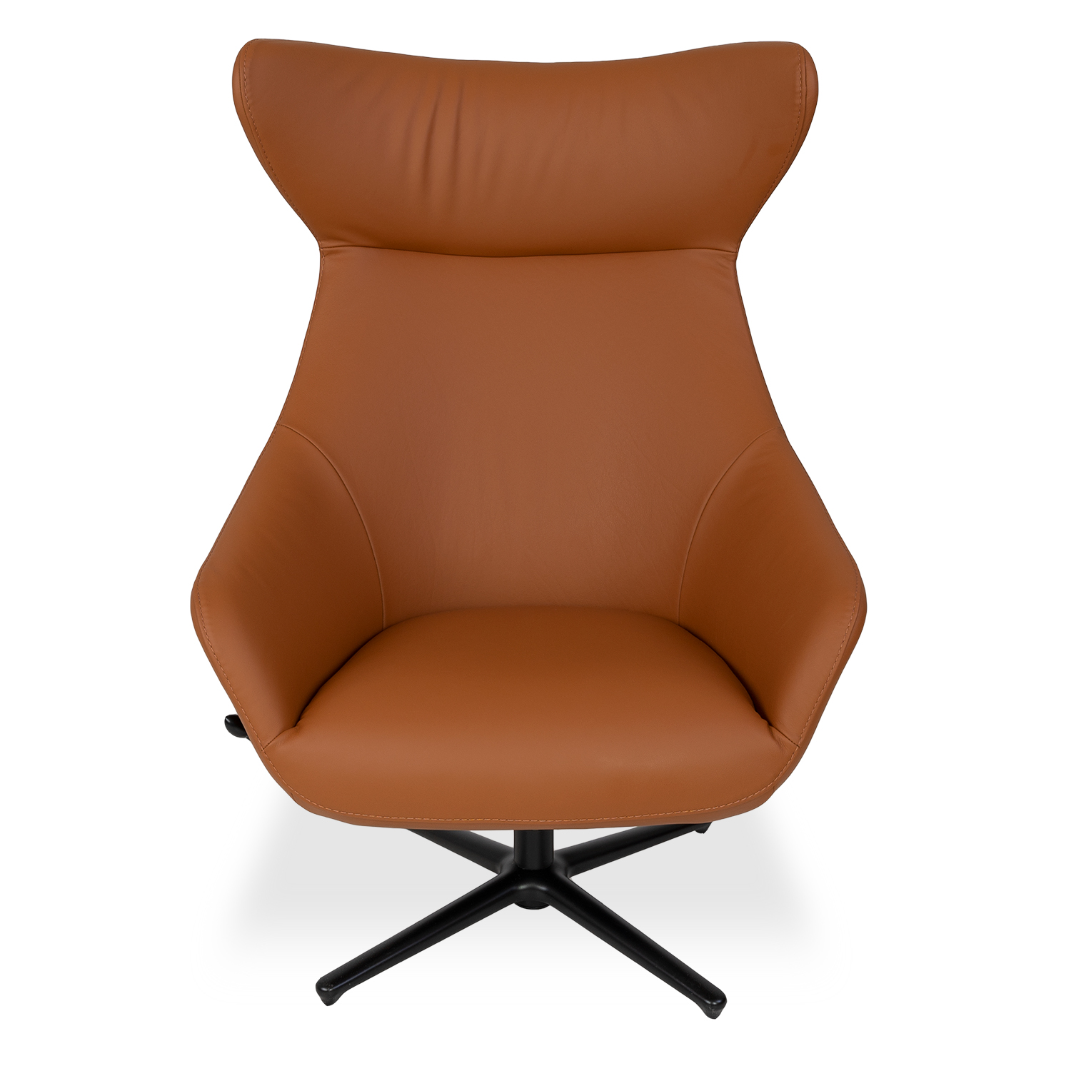 Add instant flair to your living room, bedroom, or office with the Moreno Swivel Chair. Upholstered with velvety-soft Boston leather in warm cognac brown, Moreno features a striking winged headrest and a star base made of matte black metal. With 360-degree swivel capability and a side lever that lets you enable or disable the recline function, Moreno unites comfort, flexibility, and style in one sleek package. Pair with the Moreno Ottoman to complete your setup.