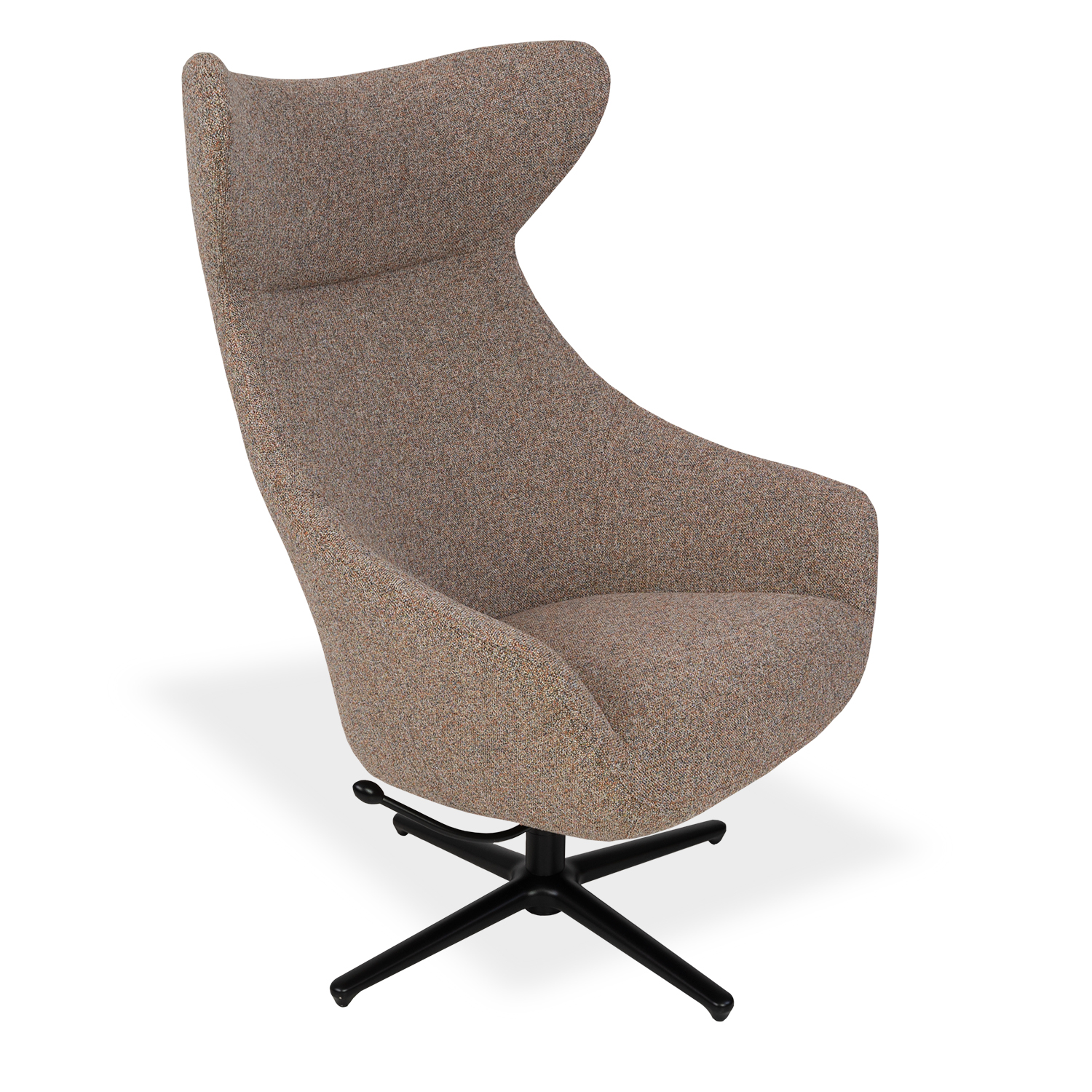 [0] => Add instant flair to your living room, bedroom, or office with the Moreno Swivel Chair. Upholstered in multicolored Caleido fabric with orange, beige, brown, and grey threads, Moreno features a striking winged headrest and a star base made of matte black metal. With 360-degree swivel capability and a side lever that lets you enable or disable the recline function, Moreno unites comfort, flexibility, and style in one sleek package. Pair with the Moreno Ottoman to complete your setup.
