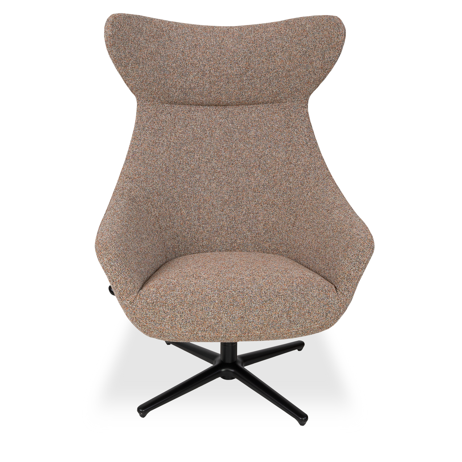 Add instant flair to your living room, bedroom, or office with the Moreno Swivel Chair. Upholstered in multicolored Caleido fabric with orange, beige, brown, and grey threads, Moreno features a striking winged headrest and a star base made of matte black metal. With 360-degree swivel capability and a side lever that lets you enable or disable the recline function, Moreno unites comfort, flexibility, and style in one sleek package. Pair with the Moreno Ottoman to complete your setup.