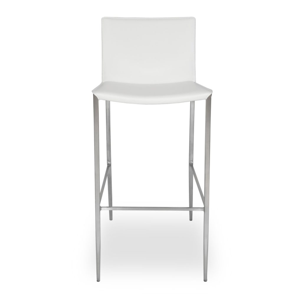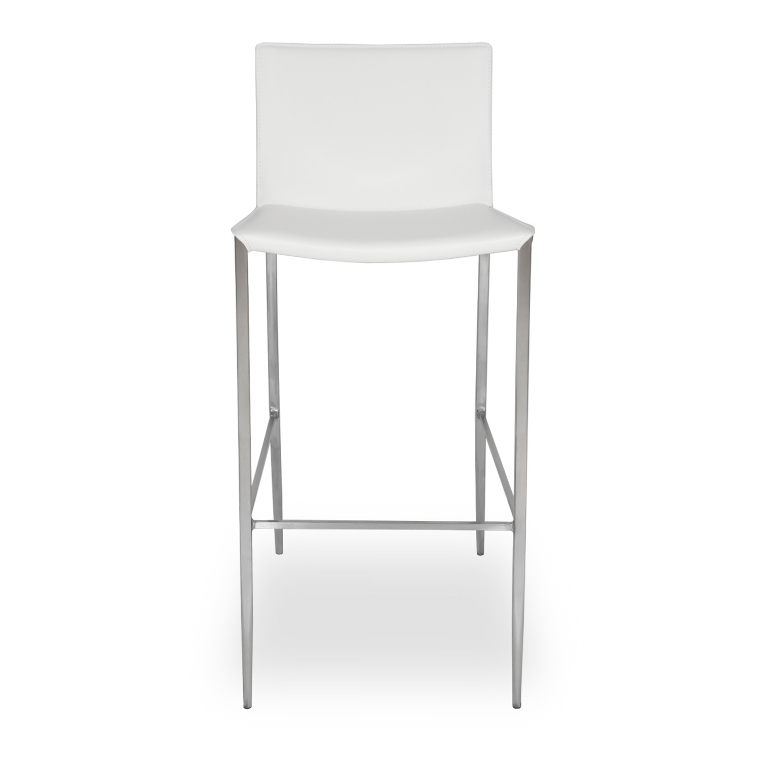 The Morris Barstool has a clean, minimalist look, with a chrome brushed stainless steel frame and regenerated leather upholstery in white. Matching stitching and black piping on the back enhance Morris' simple elegance, while the slightly curved back hugs in toward the lower spine to boost your comfort. Morris is proof that, sometimes, less is more.