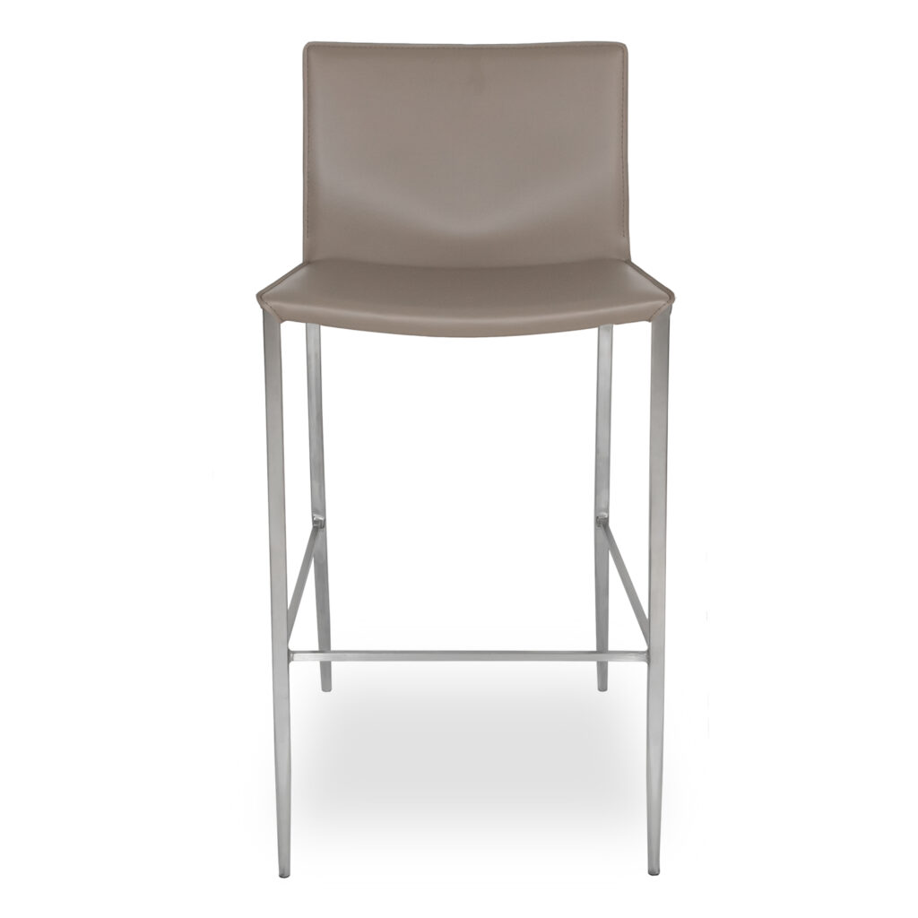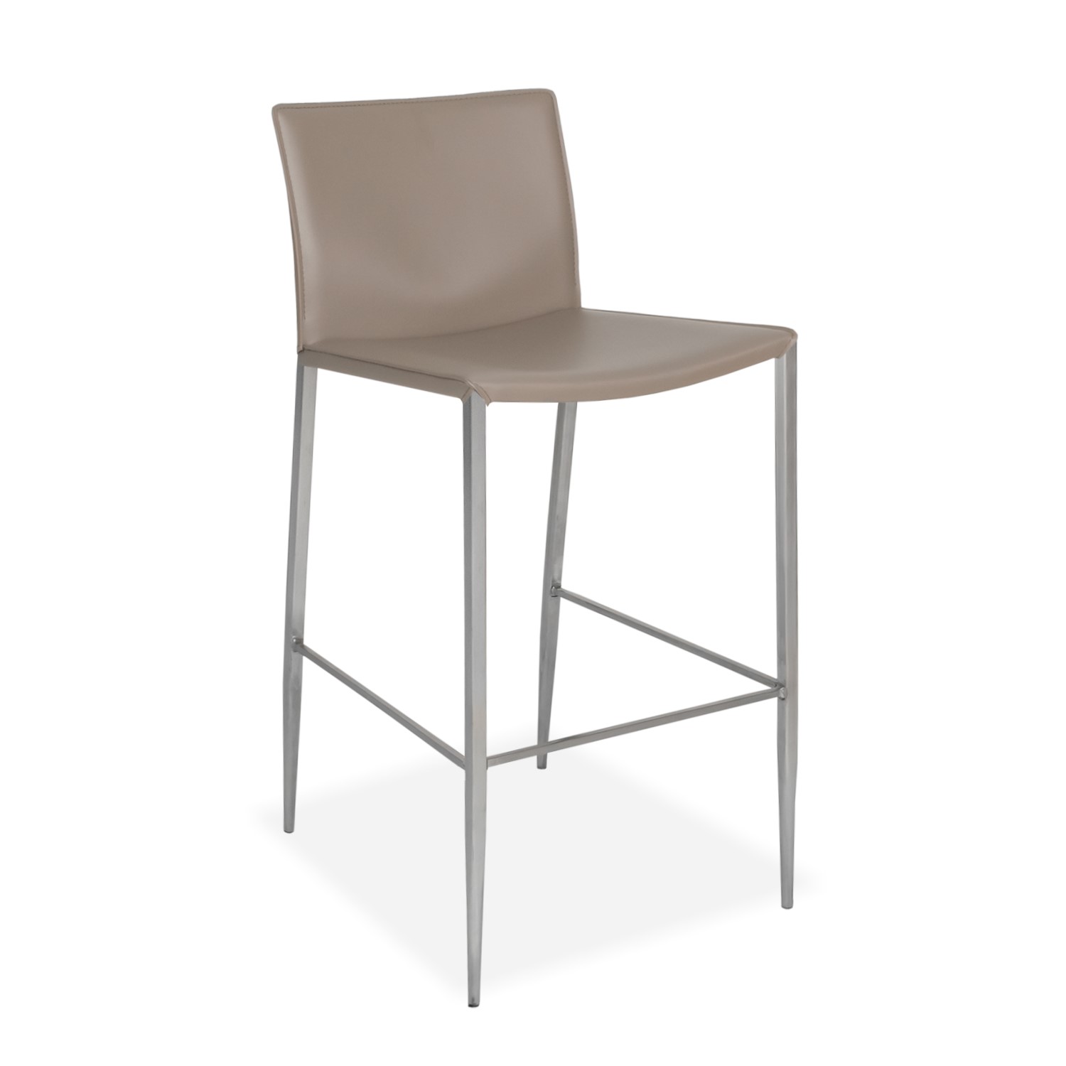 The Morris Barstool has a clean, minimalist look, with a chrome brushed stainless steel frame and regenerated leather upholstery in taupe grey. Matching stitching and black piping on the back enhance Morris' simple elegance, while the slightly curved back hugs in toward the lower spine to boost your comfort. Morris is proof that, sometimes, less is more.