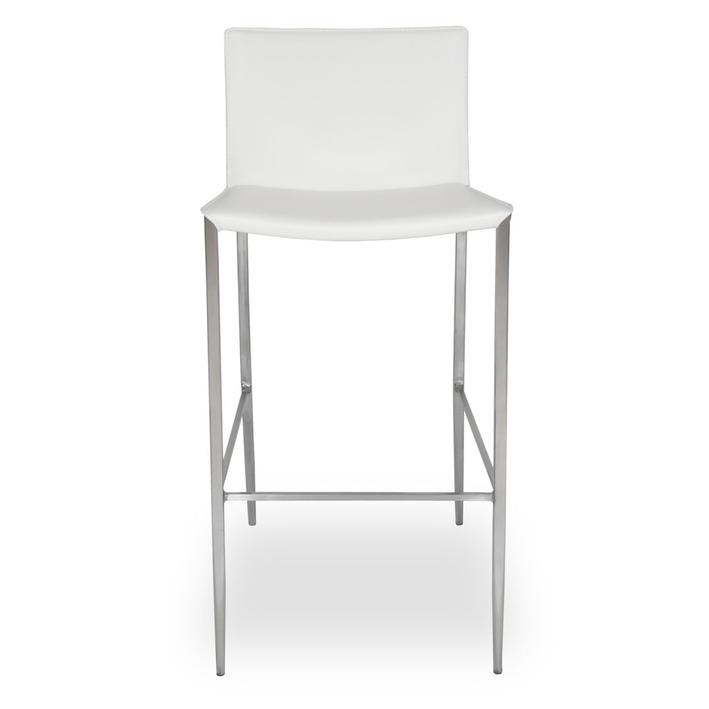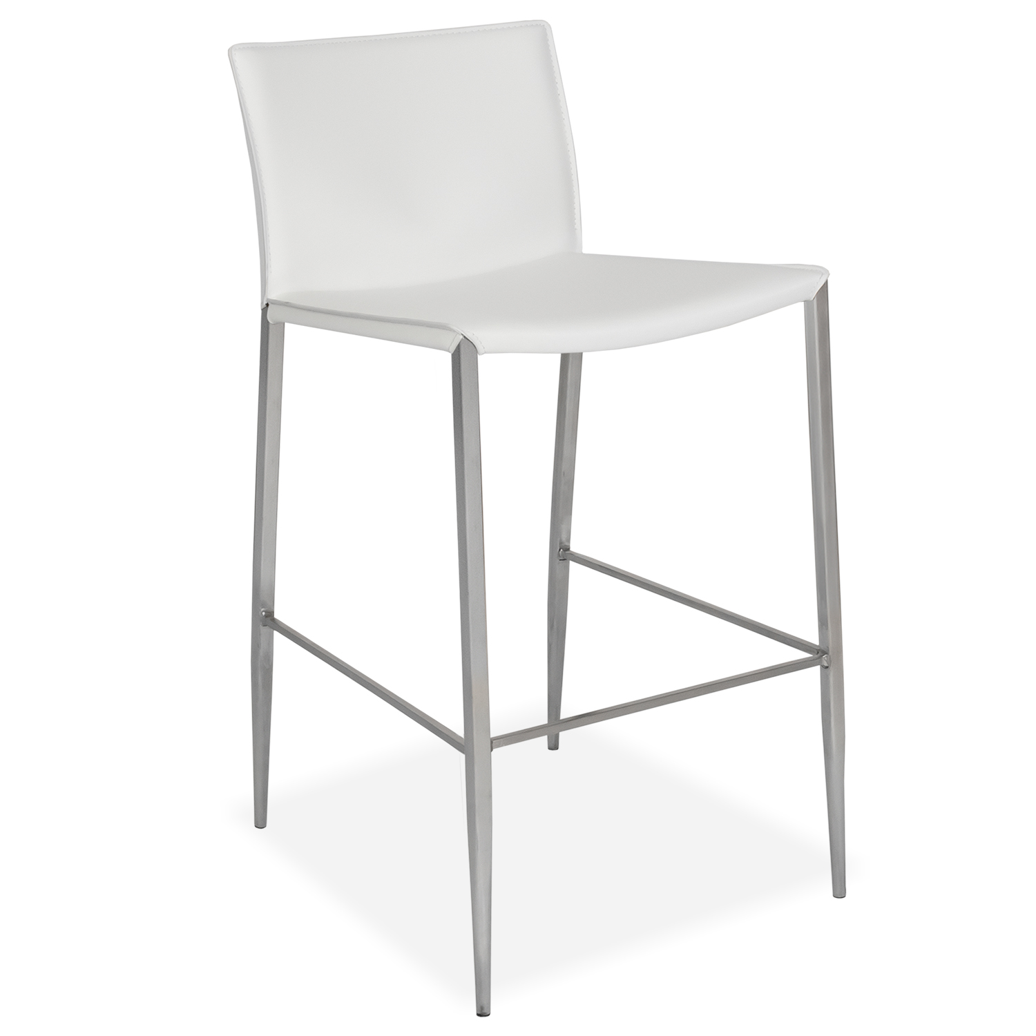 The Morris Counter Stool has a clean, minimalist look, with a chrome brushed stainless steel frame and regenerated leather upholstery in white. Matching stitching and black piping on the back enhance Morris' simple elegance, while the slightly curved back hugs in toward the lower spine to boost your comfort. Morris is proof that, sometimes, less is more.