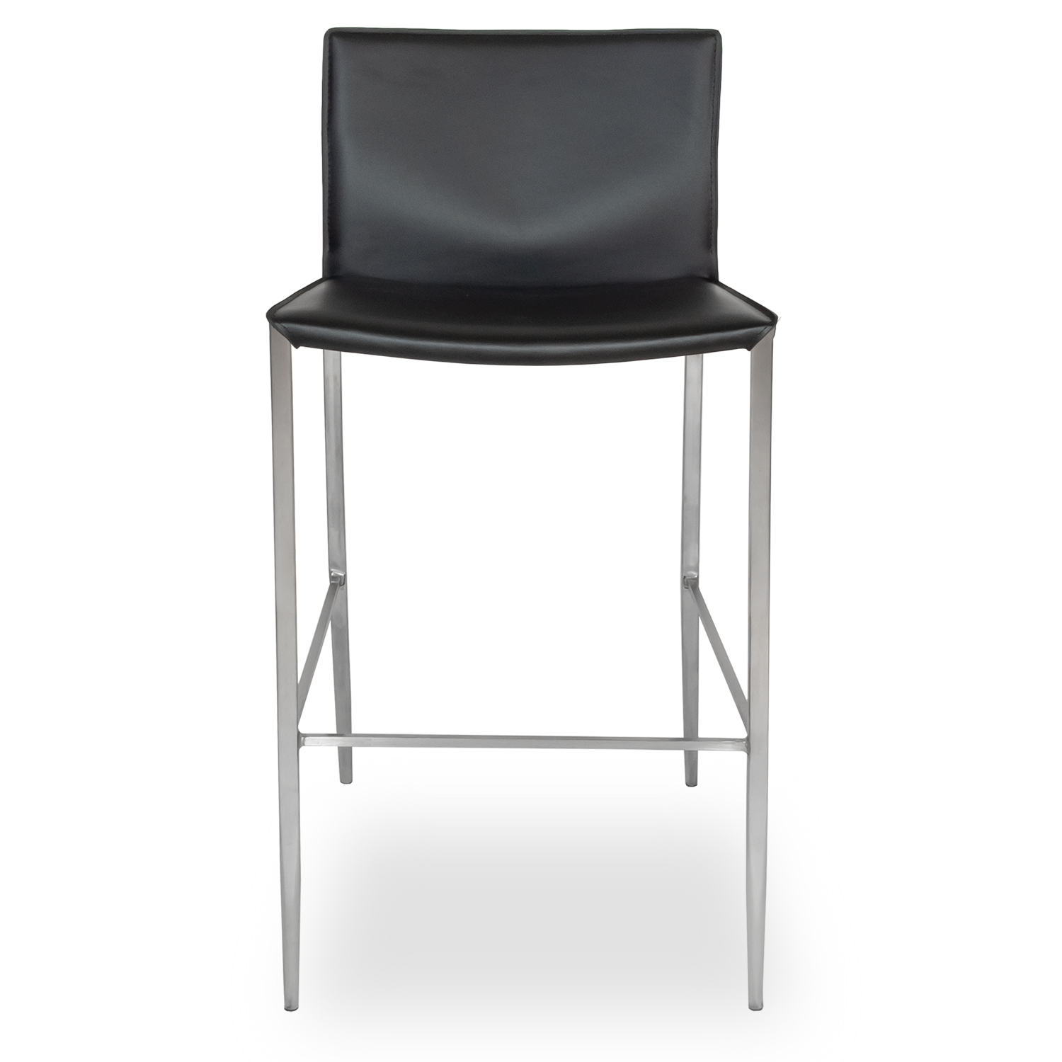 The Morris Counter Stool has a clean, minimalist look, with a chrome brushed stainless steel frame and regenerated leather upholstery in black. Matching stitching and black piping on the back enhance Morris' simple elegance, while the slightly curved back hugs in toward the lower spine to boost your comfort. Morris is proof that, sometimes, less is more.