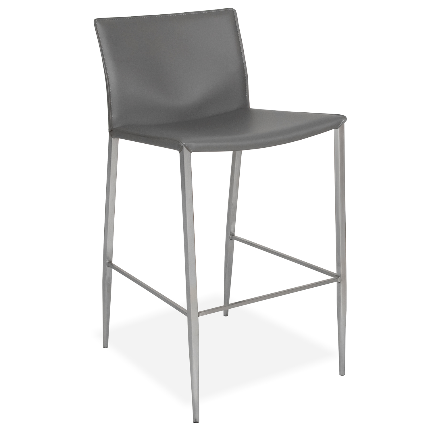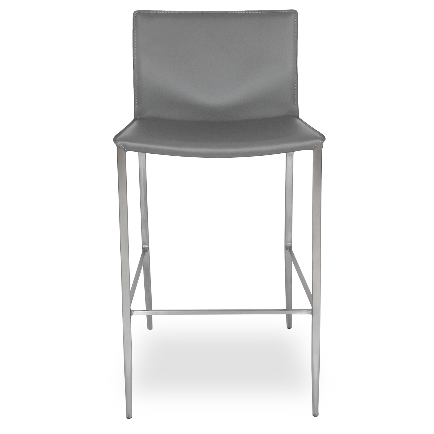 The Morris Counter Stool has a clean, minimalist look, with a chrome brushed stainless steel frame and regenerated leather upholstery in slate grey. Matching stitching and black piping on the back enhance Morris' simple elegance, while the slightly curved back hugs in toward the lower spine to boost your comfort. Morris is proof that, sometimes, less is more.