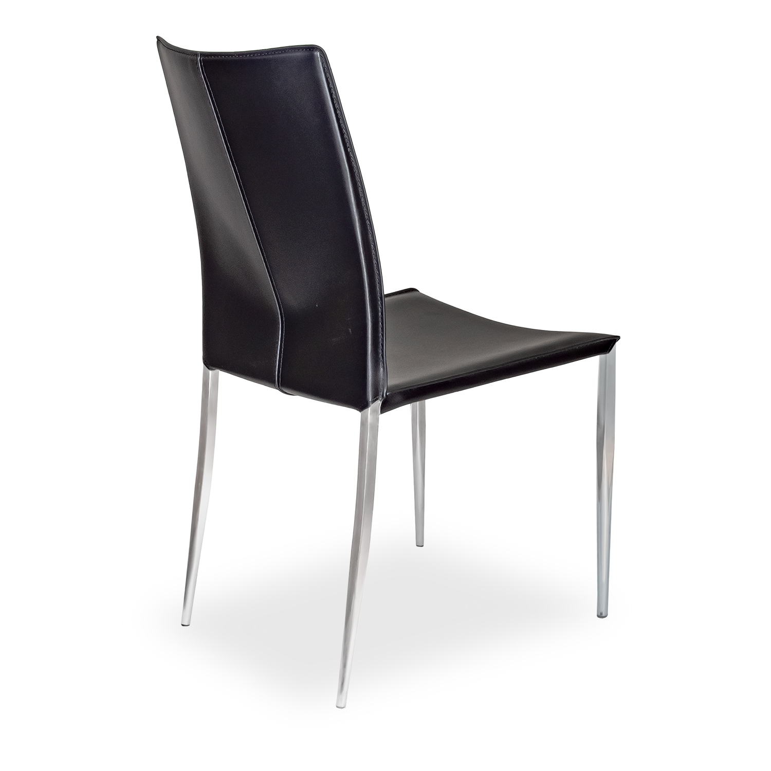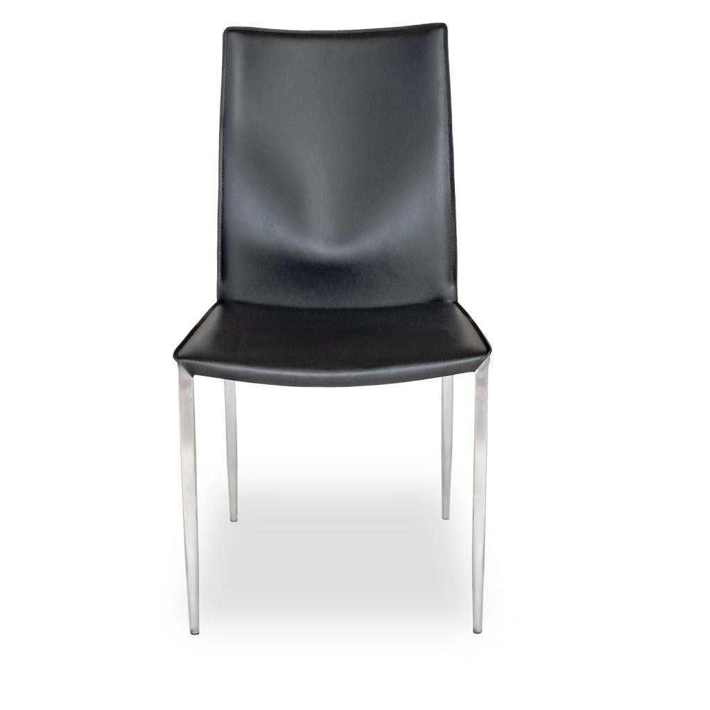 [0] => morris side chair black 08 regenerated leather. black piping on back. matchiing stitch. brushed stainless steel legs