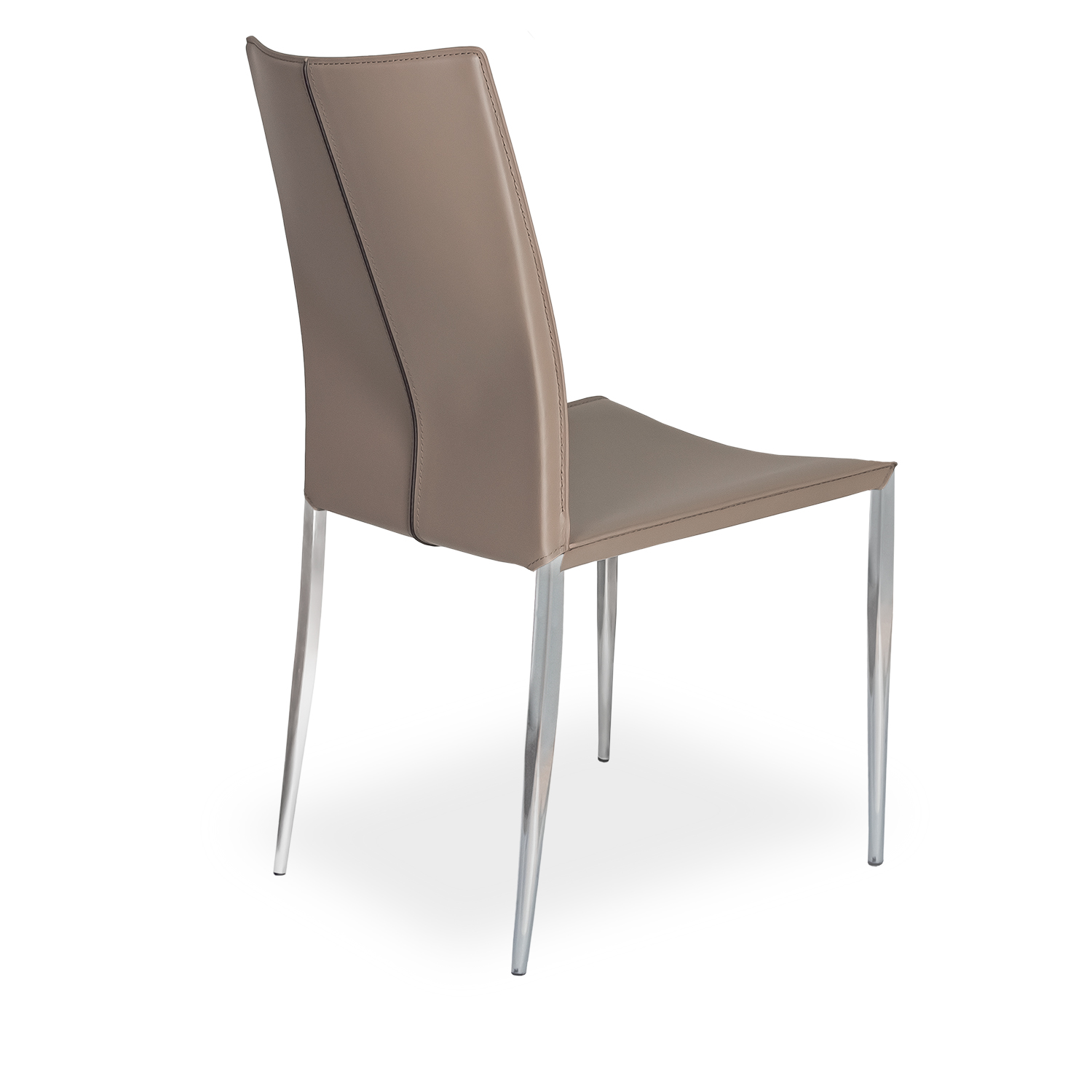 The Morris Side Chair has a clean, minimalist look, with chrome brushed stainless steel legs and regenerated leather upholstery in taupe grey. Matching stitching and black piping on the back enhance Morris' simple elegance, while the slightly curved seat back hugs in toward the lower spine to boost your comfort. Morris is proof that, sometimes, less is more.