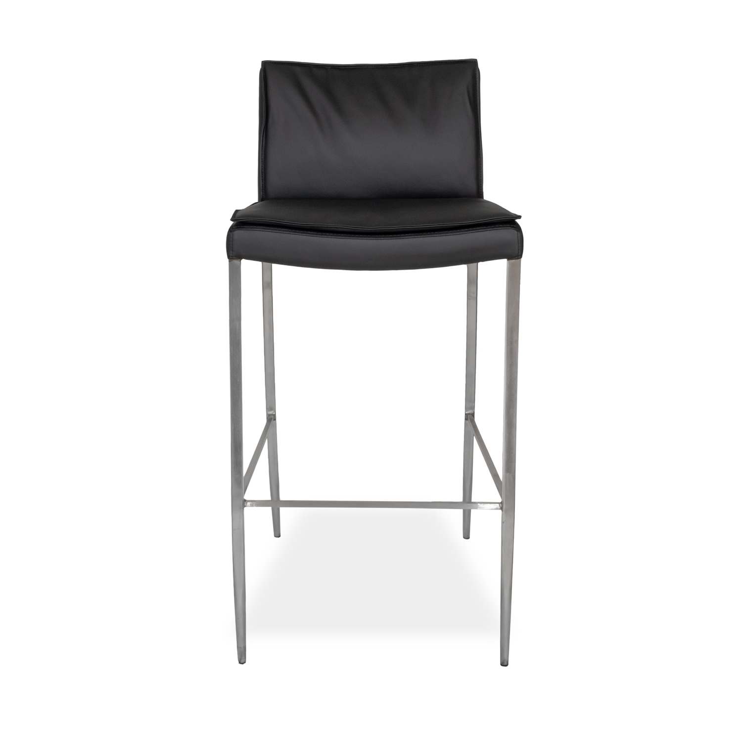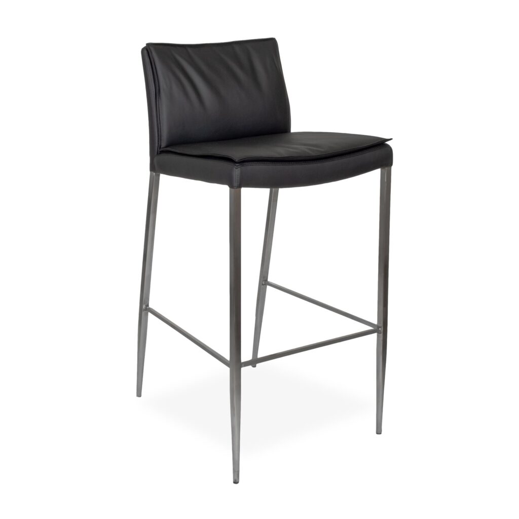The Morris Soft Barstool has a clean, minimalist look, with a chrome brushed stainless steel frame and soft leatherette upholstery in black. Matching stitching and the layered design of the cushions add a graceful touch, while the extra cushioning on the seat and back boost your comfort. Morris is proof that, sometimes, less is more.