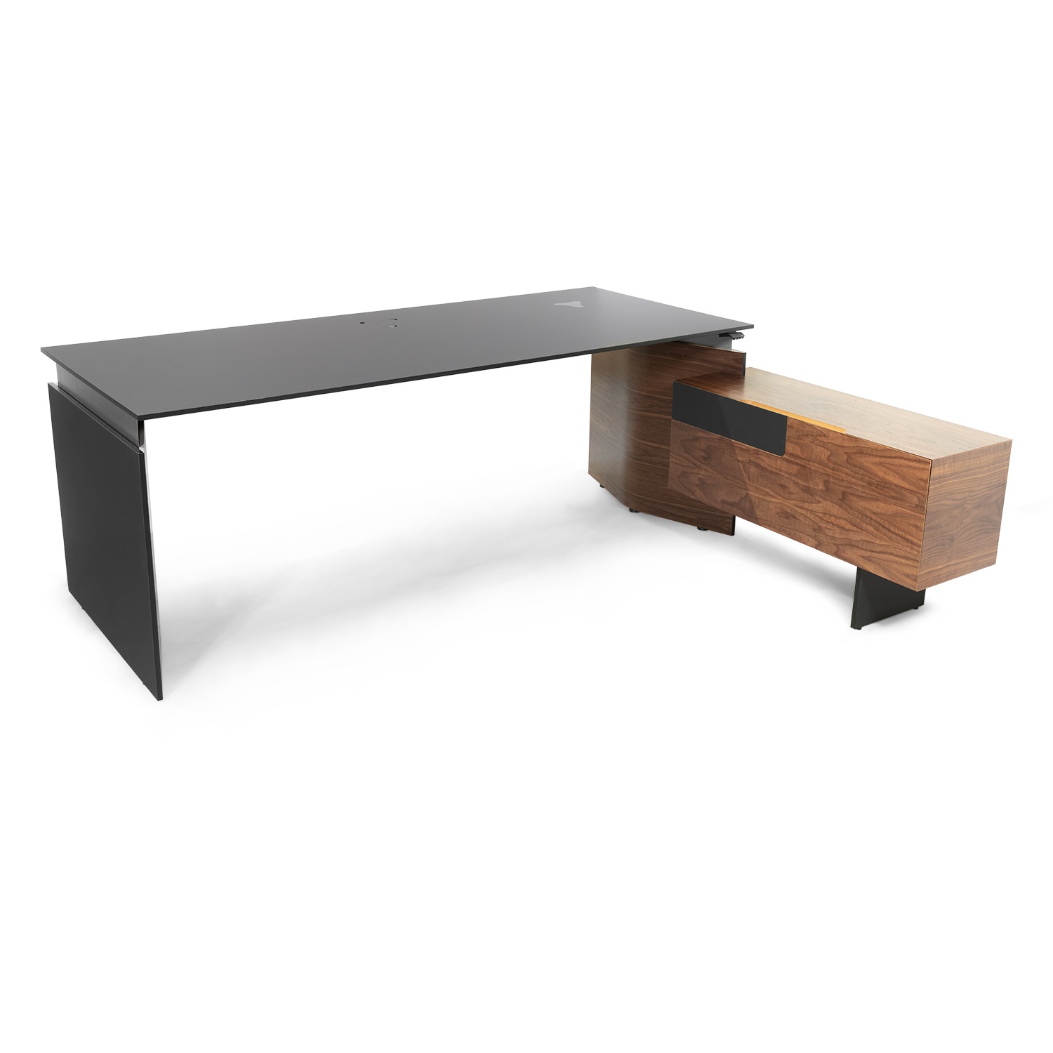 [0] => The Move&Lead Executive Sit-Stand Desk features minimalist, functional design, with clean, elegant lines, and a combination of materials that make a strong visual impact. Black fenix laminate and natural walnut veneer form a harmonious whole that includes a built-in AC power unit and wireless charger, both contained in a hidden compartment under the desk top. At the touch of a button, the desktop adjusts to your ideal work height, with the power lift base cleverly concealed by the design of the legs. Move&Lead is an active and functional desk for the modern leader.
