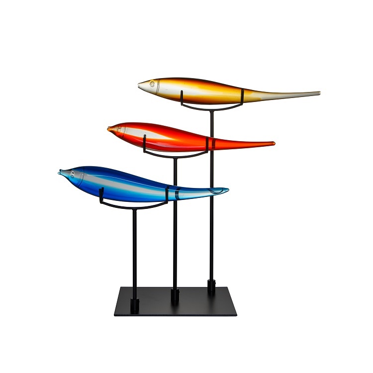 [0] => The Multi Fish trio sculpture brings to life the beautiful, colorful fish of the tropics. Each fish is hand-blown from art glass and mounted on the black metal base. Together, the fish appear to be in motion - swimming upwards as a school and forming the focal point of your space.