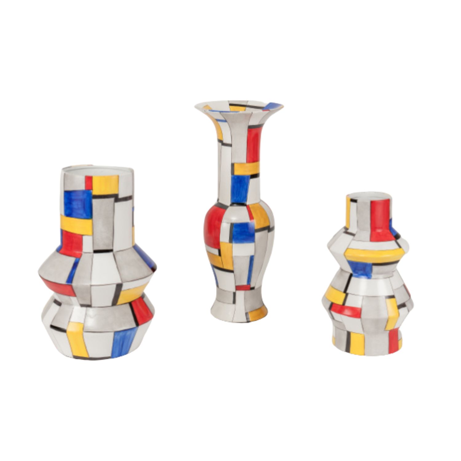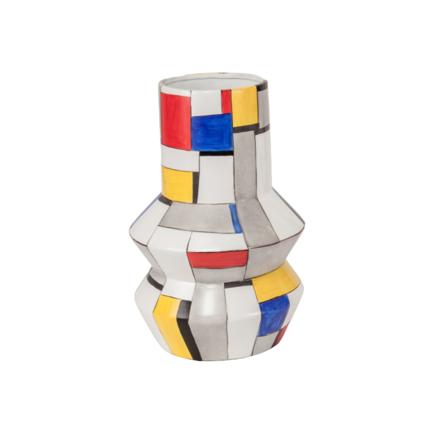 Reminiscent of cubist art, the Multicolor Vase has a bold angular body embellished with geometric lines and bright primary colors. With its allover pattern of asymmetric rectangles in red, yellow, blue, white, grey, and black, this porcelain vase can stand on its own as accent art or hold a large and equally daring bouquet.