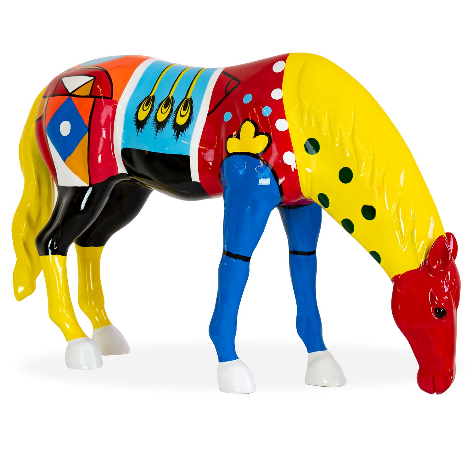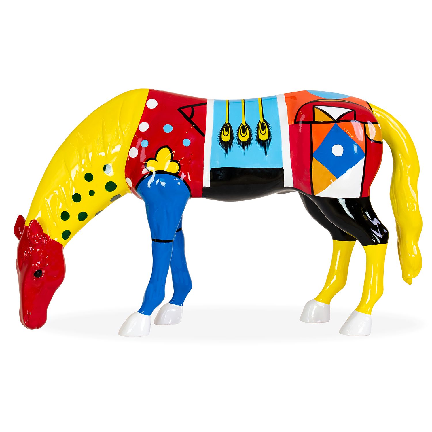 Add bright color and rustic charm to your surroundings with the My Happy Horse Sculpture. Made of polyresin with a glossy finish, this sculpture is painted in red, yellow, blue, and orange, and decorated with polka dots, geometric shapes, and feather motifs. Perfect for any horse lover's home, My Happy Horse can stand stably on any flat surface to bring a smile to your face.