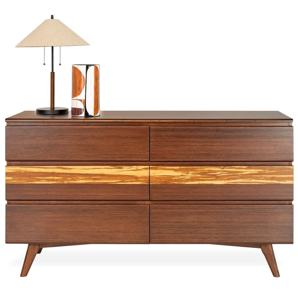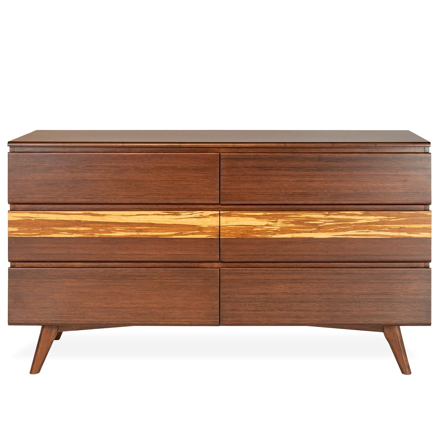 The Nani Dresser, available in sable with an exotic tiger bamboo accent on its two middle drawers, is crafted from 100% solid Moso bamboo -- one of the most sustainable resources you can find. Nani features clean contemporary design with beautifully angled legs and rich color. This dresser is finished on all four sides and features soft-closing, undermount drawer glides on its six roomy storage drawers.