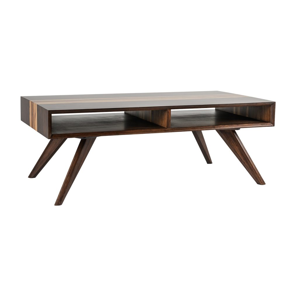 The Nani Coffee Table is available in sable and features a striking tiger bamboo accent. The color is as rich as the bamboo patterning, and the triangular legs taper down smoothly. This table has clean lines and smooth edges, and includes open storage space.