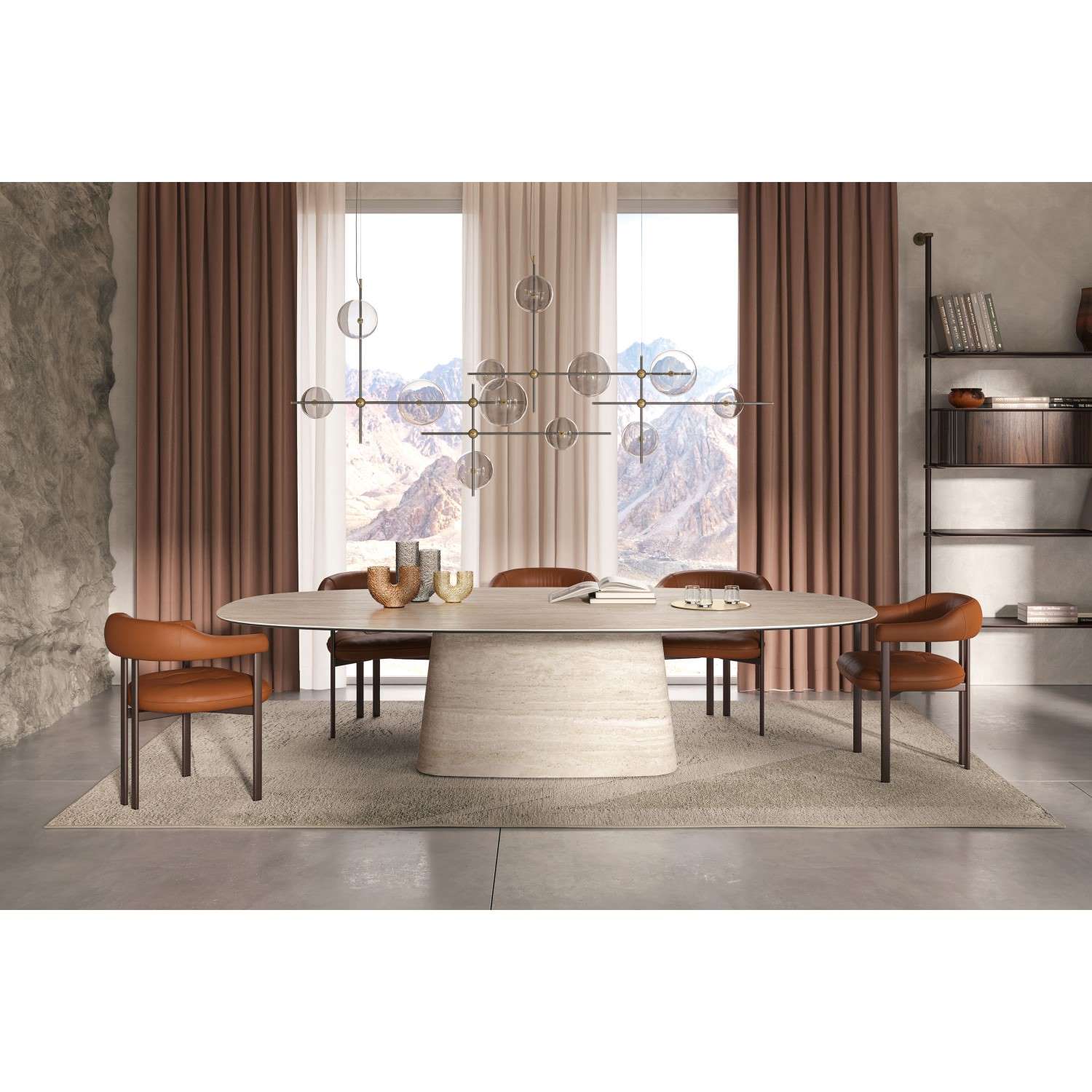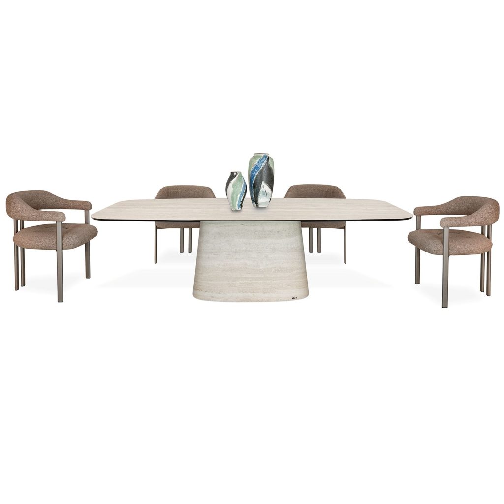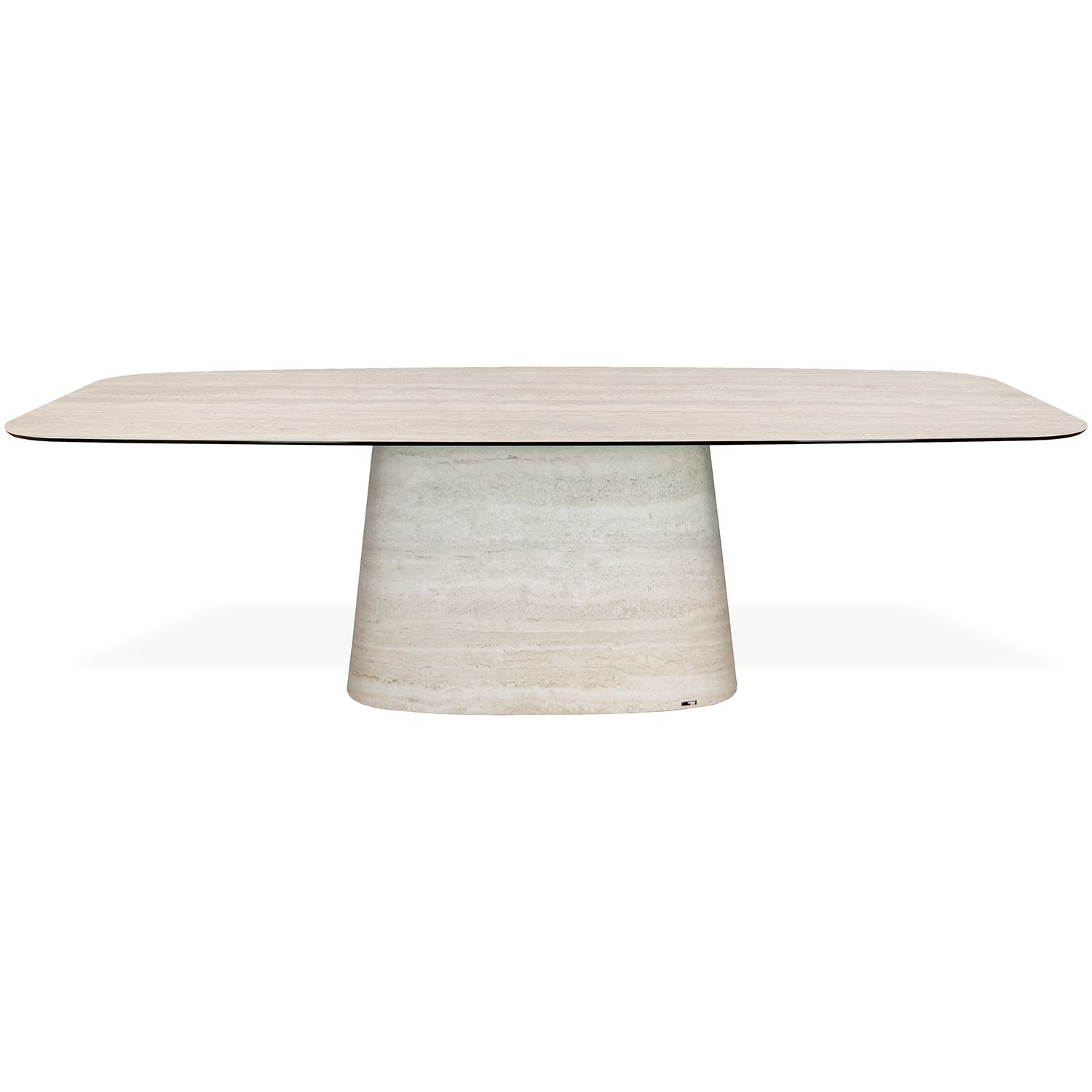 Simple yet stunning, the Napoleon Dining Table is crafted in Italy from beige Colosseo ceramic marble with stone-like striations. Napoleon's base is made with a cutting-edge ceramic modelling technique that produces curved slabs, and has a recessed vertical groove on one side. The rounded corners of the rectangular tabletop echo the curves of the base, resulting in a clean, yet luxurious, look that will uplift any dining occasion.