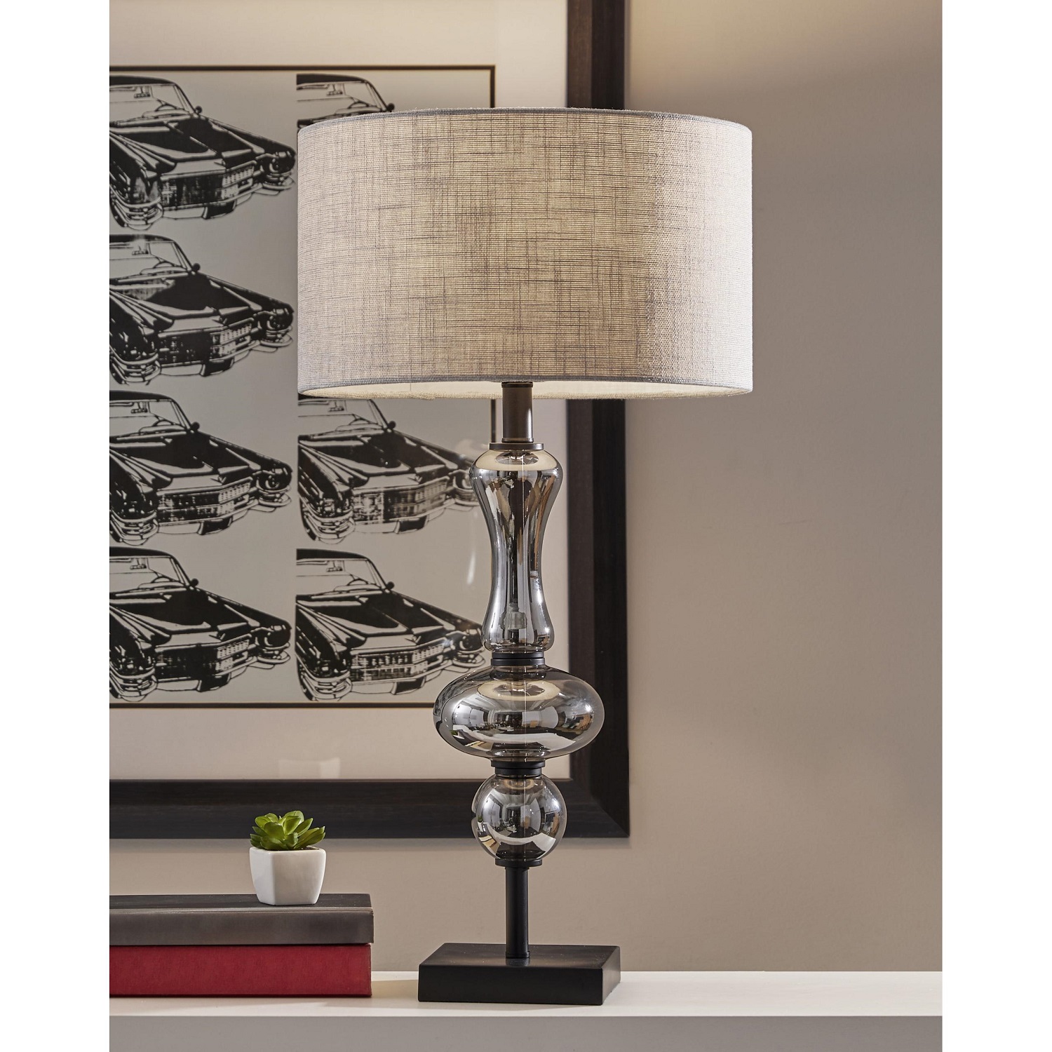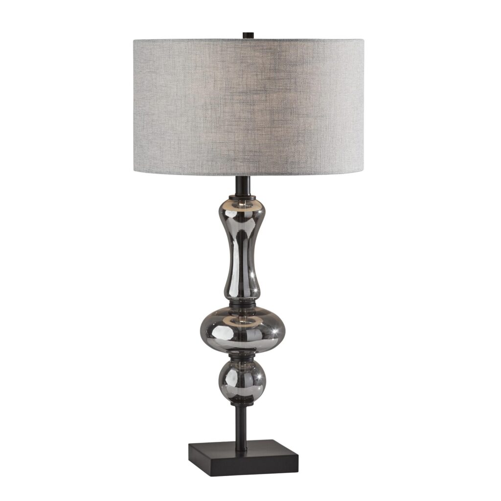 [0] => The Natalie Table Lamp features a contemporary take on a traditional silhouette. The Smoked Mercury glass body is complemented by the black-finished base. A light grey, textured fabric shade, made of a high-quality linen blend, softens the look. Turn the lamp on and off with a simple switch on the socket.