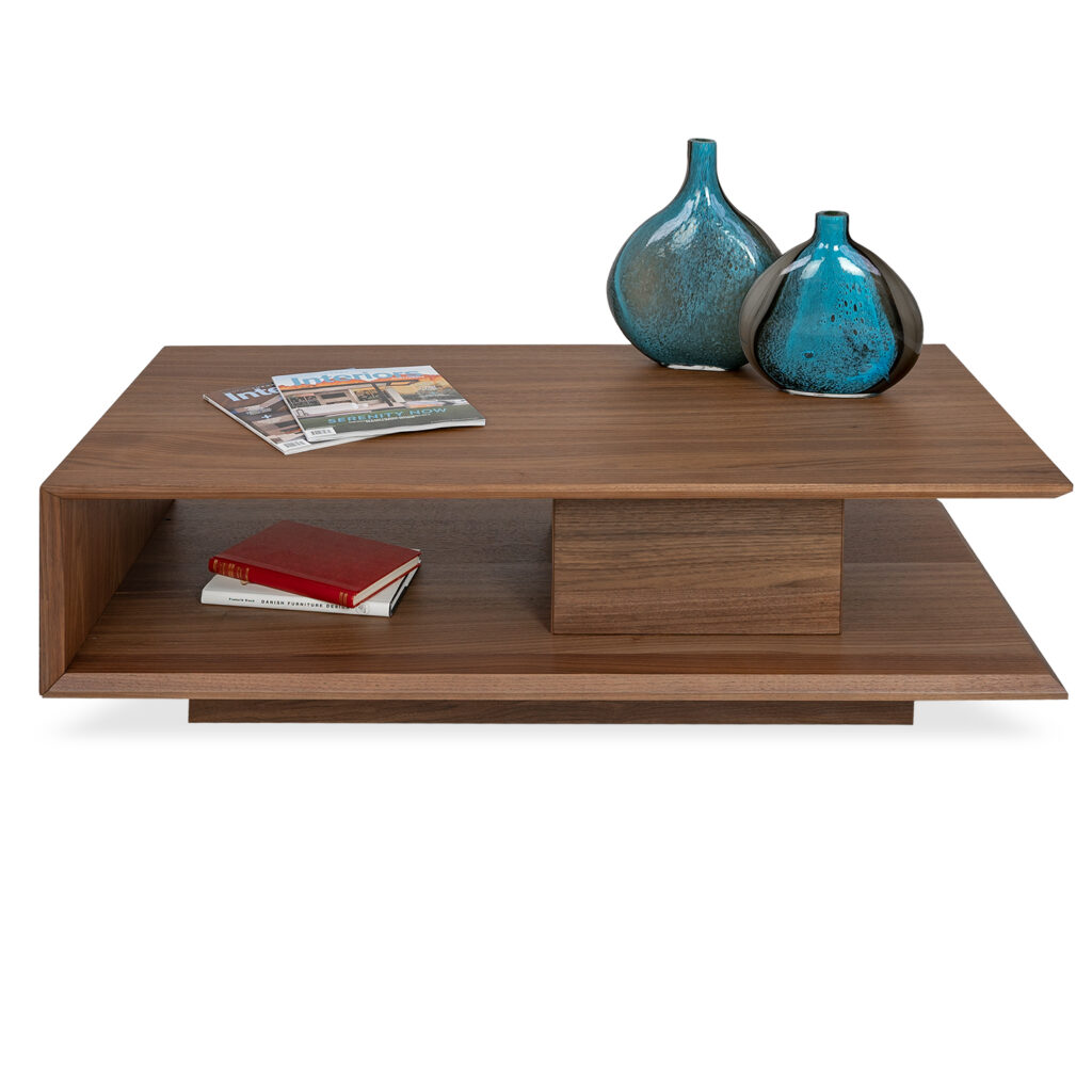 The Nathan Coffee Table features a clean, streamlined design with an open structure, asymmetrical shelf, and one drawer. With a walnut veneer, this table has subtle, beveled edges that create a cosmopolitan look, and plenty of storage space for remotes, magazines, and more.