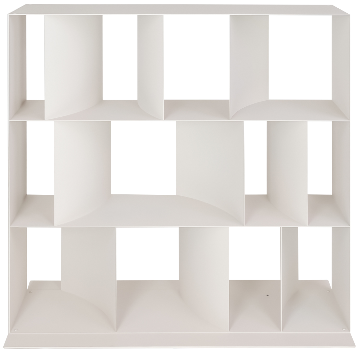 The Nautilus Bookcase, made in Italy, is edgy and sophisticated, with a steel structure and pearl embossed finish. Its modular design allows it to be stacked or set up side by side with additional bookcases, or used as a room divider. Nautilus, derived from the Greek word "sailor," features inclined elements reminiscent of boat sails that create a natural play with light and shadow. Arrange books, trinkets, photo frames, and more among the spaces and shelves to be admired.
