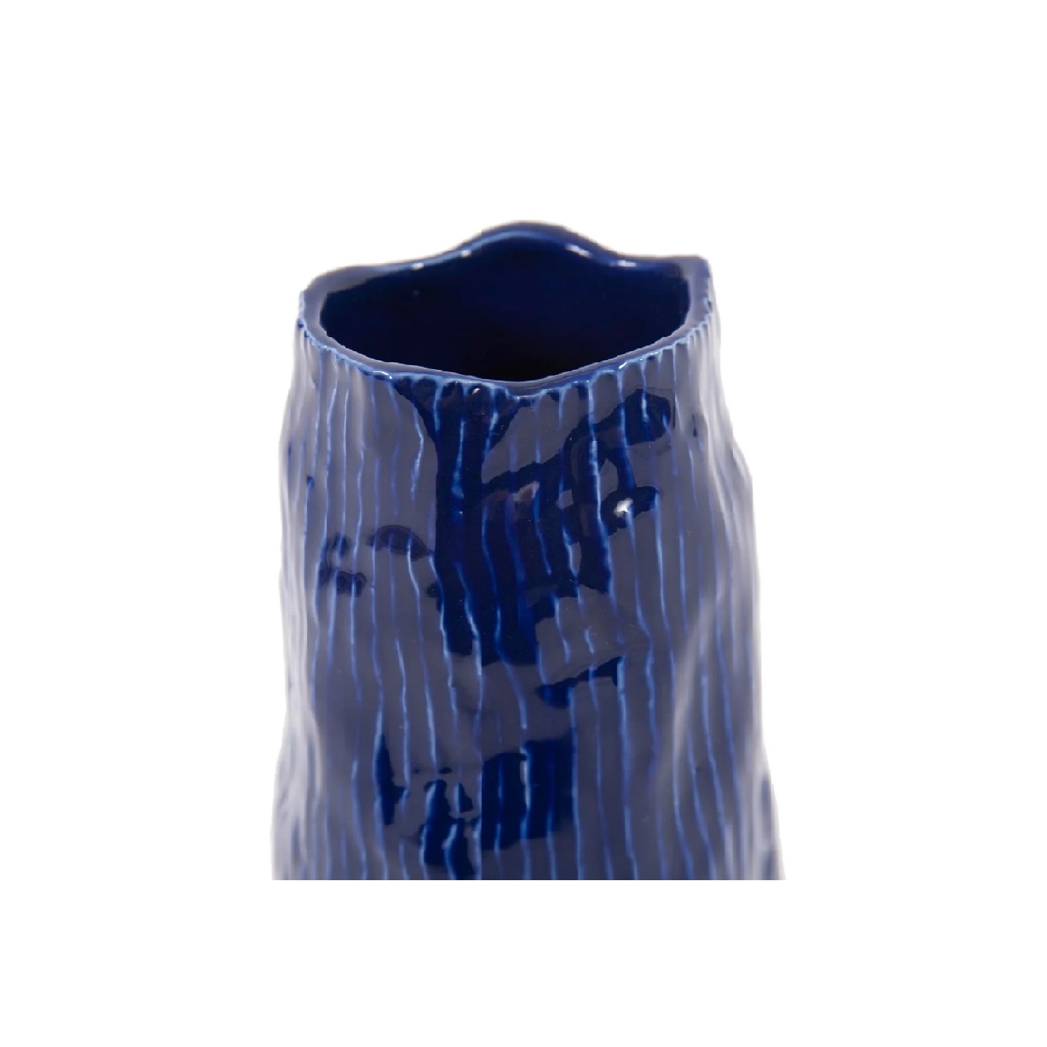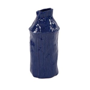 This 11" Navy Blue Vase has a free-form shape and a textured surface that calls to mind the movement of ocean water. The striking deep-blue color, with thin lines of lighter blue, was inspired by the waters surrounding the Mediterranean island of Lipari. Crafted in ceramic from handmade molds, each vase receives the attention of expert artisans who apply the finishing details by hand. This smaller vase with its tapered shape is perfect for a tasteful bouquet or as a stand-alone piece.
