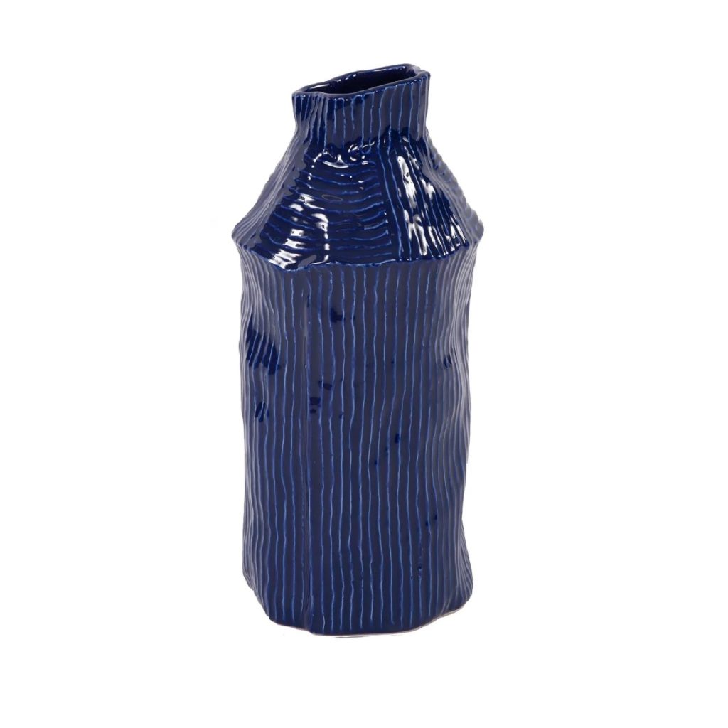 [0] => This 14" cylindrical Navy Blue Vase has a textured surface that calls to mind the movement of ocean water. The striking deep-blue color, with thin lines of lighter blue, was inspired by the waters surrounding the Mediterranean island of Lipari. Crafted in ceramic from handmade molds, each vase receives the attention of expert artisans who apply the finishing details by hand. This vase is perfect for a tasteful bouquet or as a stand-alone piece.