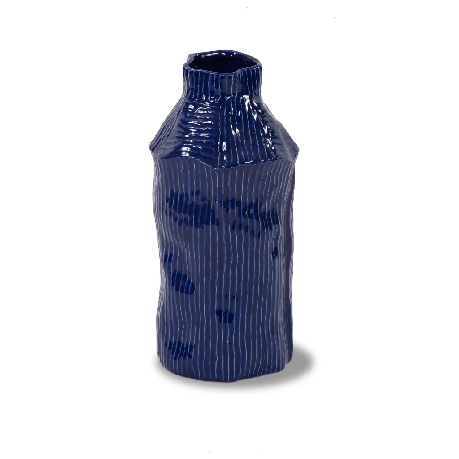 This 14" cylindrical Navy Blue Vase has a textured surface that calls to mind the movement of ocean water. The striking deep-blue color, with thin lines of lighter blue, was inspired by the waters surrounding the Mediterranean island of Lipari. Crafted in ceramic from handmade molds, each vase receives the attention of expert artisans who apply the finishing details by hand. This vase is perfect for a tasteful bouquet or as a stand-alone piece.