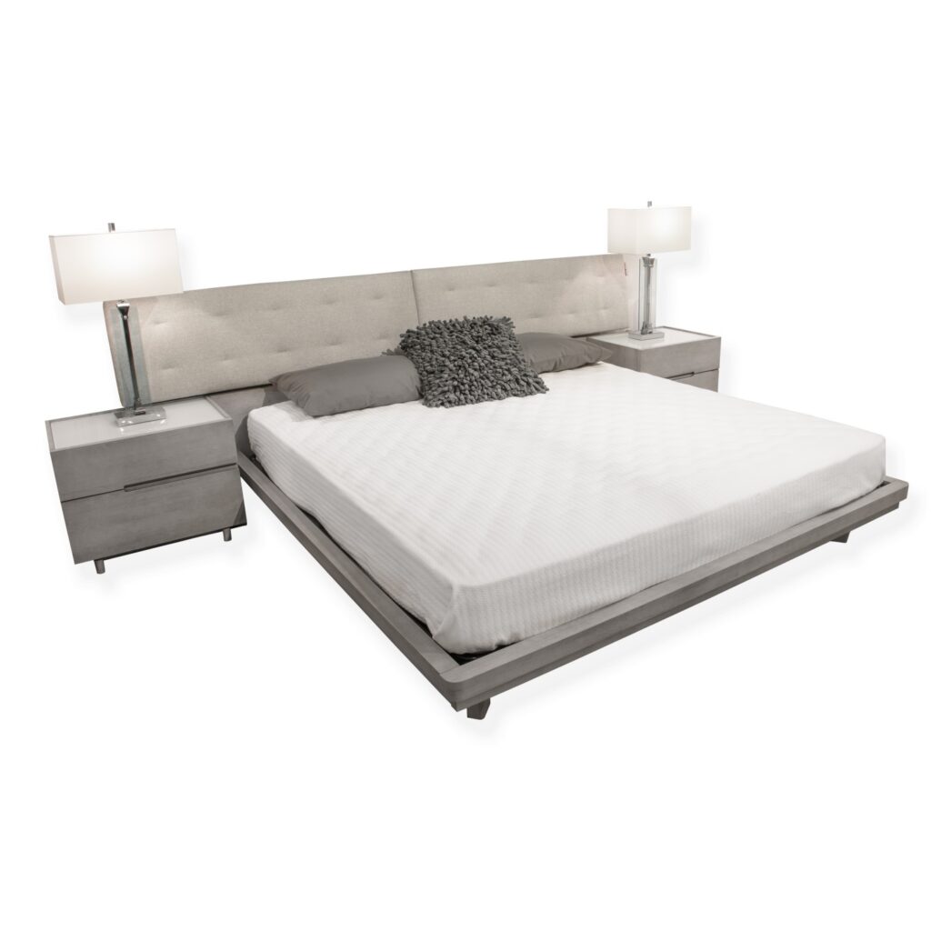 [0] => nelson eastern king bed in grey walnut tortora 536 with head board upholstered in fabric chess 061. includes metal panel mattress support.