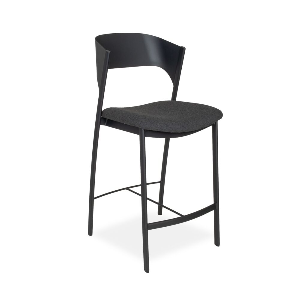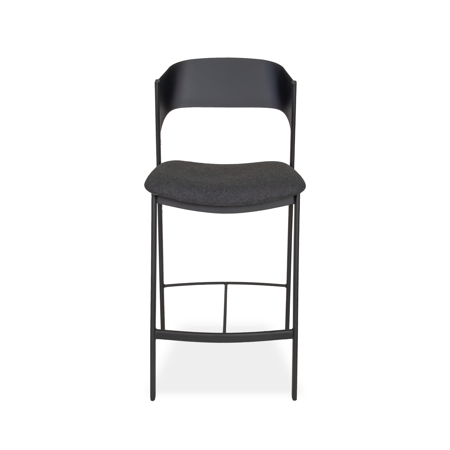 The Nestor Counter Stool is the definition of sleek and contemporary, with a curved back and monochromatic look. The powder-coated Black Coral base features a subtle grainy texture with a matte finish, while the Doodle black fabric seat, made of recycled fibers, has a textured boucle weave with a sheepskin effect. Nestor's straight lines and sharp angles will heighten the sophistication of any dining space.