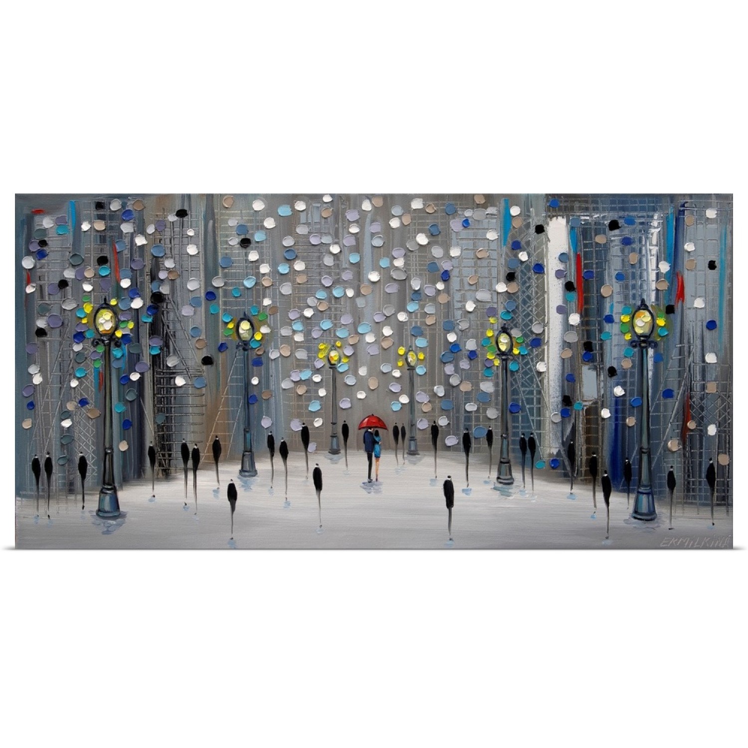 Night City Park, by Ekaterina Ermilkina, is a contemporary wall art that playfully uses texture and shape to depict a nocturnal scene in a city park. Amidst a crowd of anonymous black figures stands a couple whose red umbrella and blue clothing make them a natural focal point. Textured dots in blue, white, grey, and tan float over the heads of the human figures, while etched lines in the background evoke the forms of buildings and ladders. Available with a glossy finish, Night City Park offers a whimsical take on an urban scene.