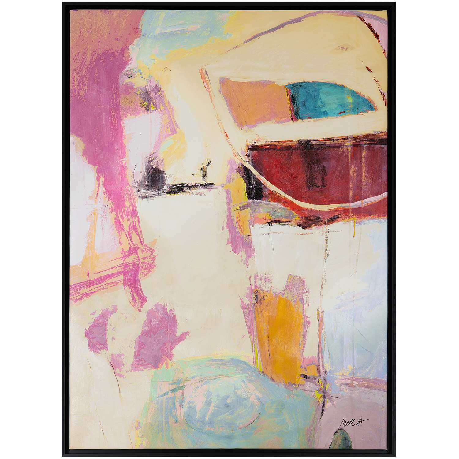 The Nite Lites II Wall Art, by the artist Mell D., is a contemporary abstract painting full of soft tones and tranquil vibes. Shades of cream and pink dominate the canvas, accented with stronger hues of orange, turquoise, and rust brown. Pair with the companion Nite Lites I Wall Art to add a soothing and stylish accent to your space. Available with a black frame.
