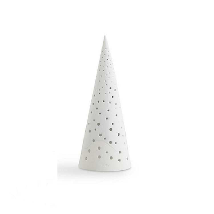 [0] => The Nobili Tealight holder by the Danish porcelain company Kahler brings warmth and light into your home with a mninimalist aesthetic. Inspired by the dark, snowy, and majestic forests in Scandinavia, the Snow tealight holder, which measures 9 1/2'' in height, is fashioned as a simple white cone with round perforations. When a candle is lit underneath the candle holder, the Nobili cone glows and creates beautiful patterns of light that will delight and comfort you with their warmth.