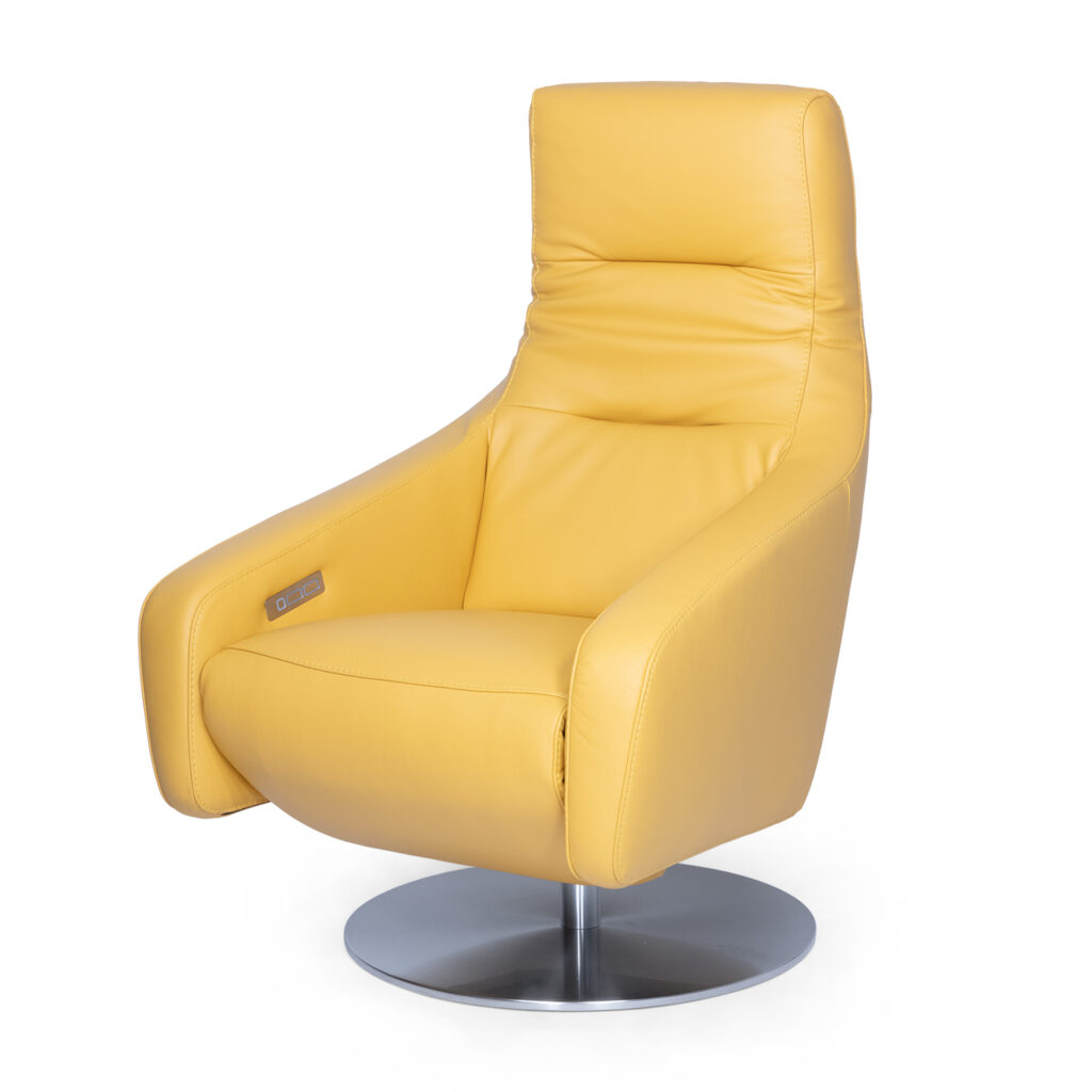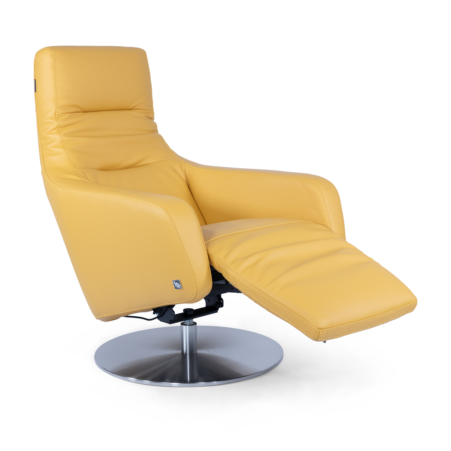 [0] => The Nora Swivel Chair with Power features bright yellow Carezza top grain leather, a round polished steel base, and a chic, retro design. Two electric motors act independently of each other to control the backrest and the seat, and the neck rest can be adjusted manually, so you can customize your comfort. The rechargeable battery reduces the need for wires. Nora will bring vibrant style and relaxation into your home.