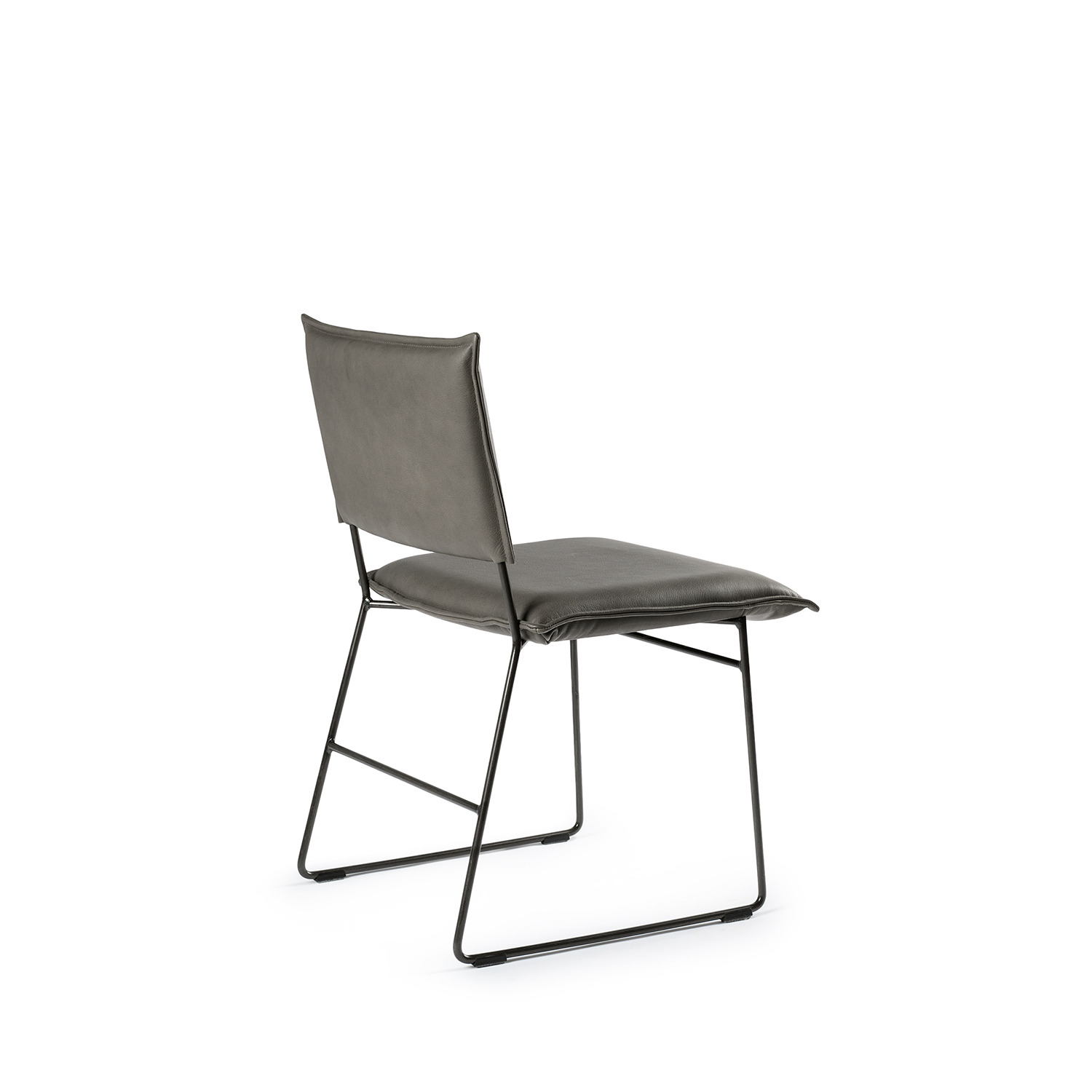 [0] => The Norman Side Chair combines soft, smooth leather and a trim, geometric steel frame to create a piece that is both comfortable and sculptural. The wide, cushioned seat complements the warmth of the leather, and the seamed edges add to the pillow-like effect. The slim design is versatile and can integrate seamlessly into any space or add a vintage element to elevate the look of a room.