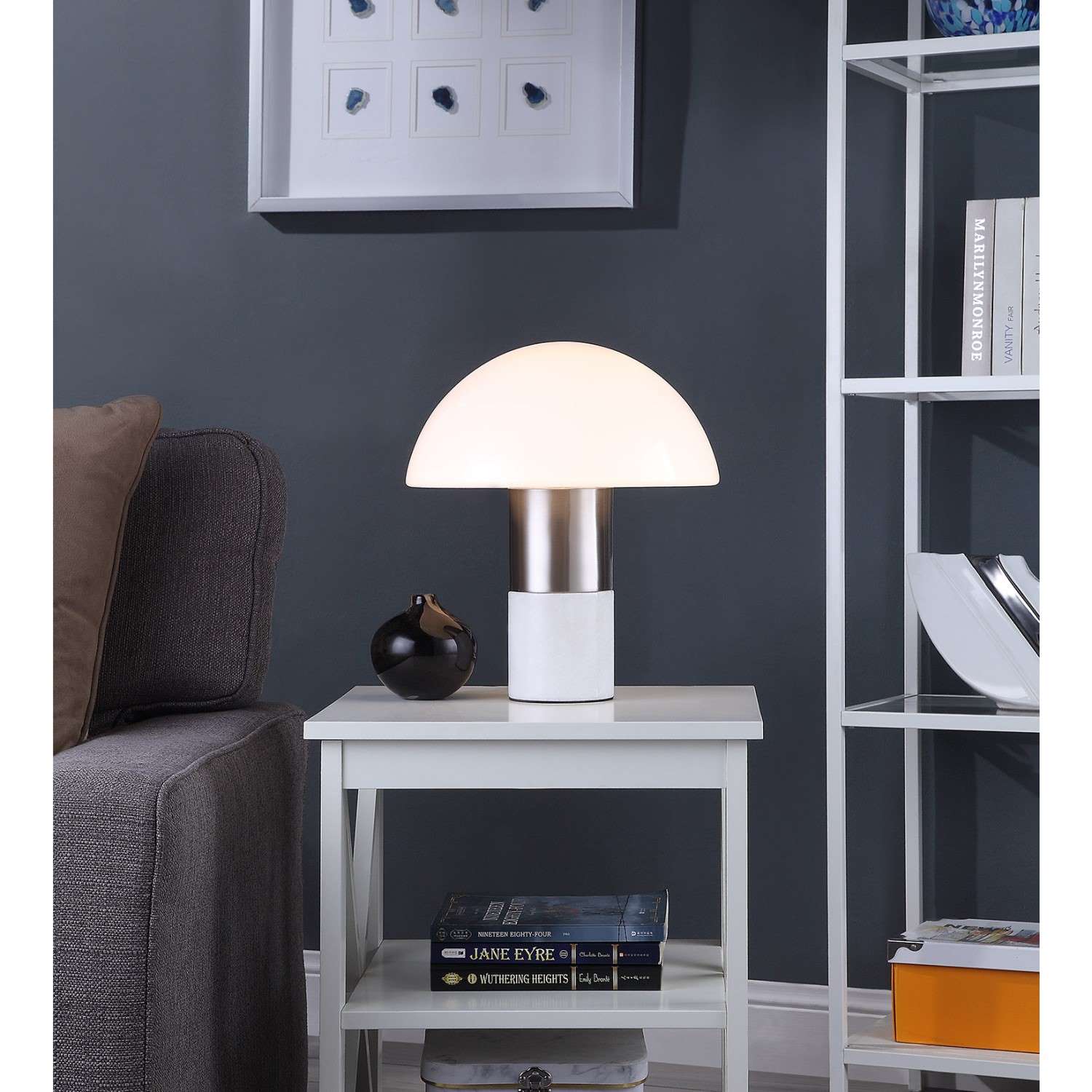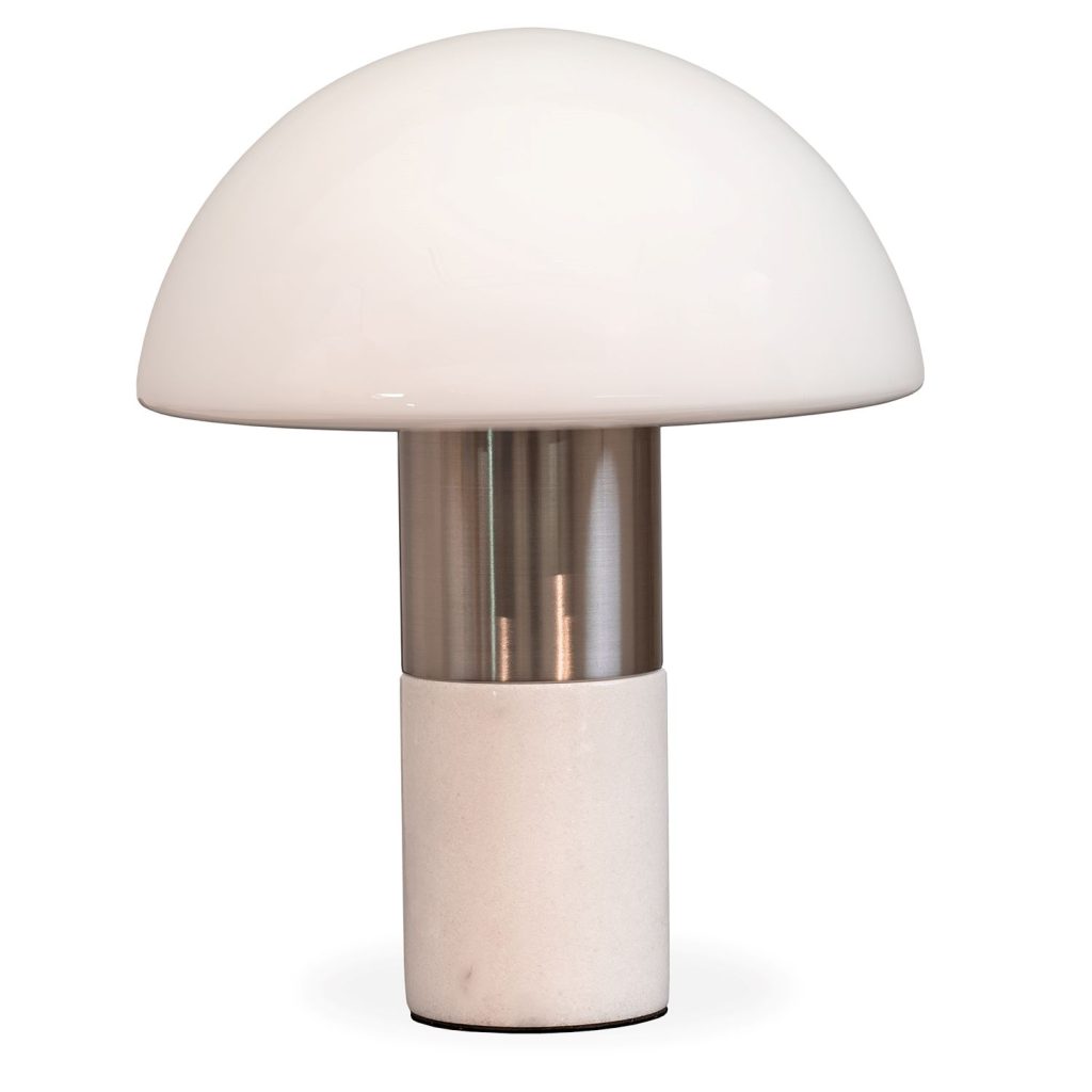 [0] => Add a touch of retro flair to your living space with the Norris Table Lamp. Its mushroom-shaped glass shade has a 70's feel that's contemporized by its satin nickel and white marble base. Feeling both eclectic and coordinated, Norris is the perfect compact lamp for any design environment. Available with an on/off cord switch.
