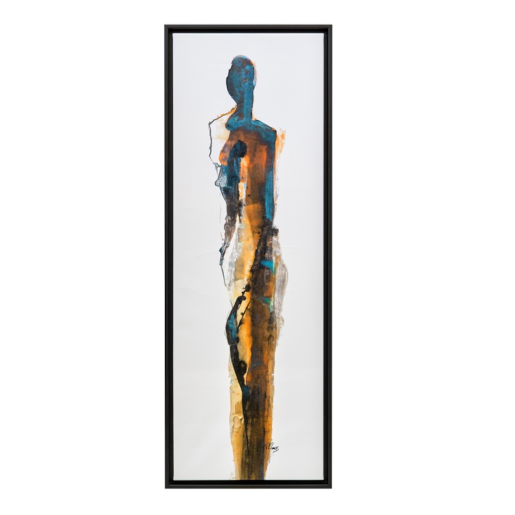 [0] => The Noteworthy I painting, on canvas by artist V. Klauss, depicts an abstract, geometric figure, starkly portrayed against a white background. Layered hues of blue, gold, and black bring the solitary figure to life, creating a calming, peaceful atmosphere. This painting has a black floater frame.