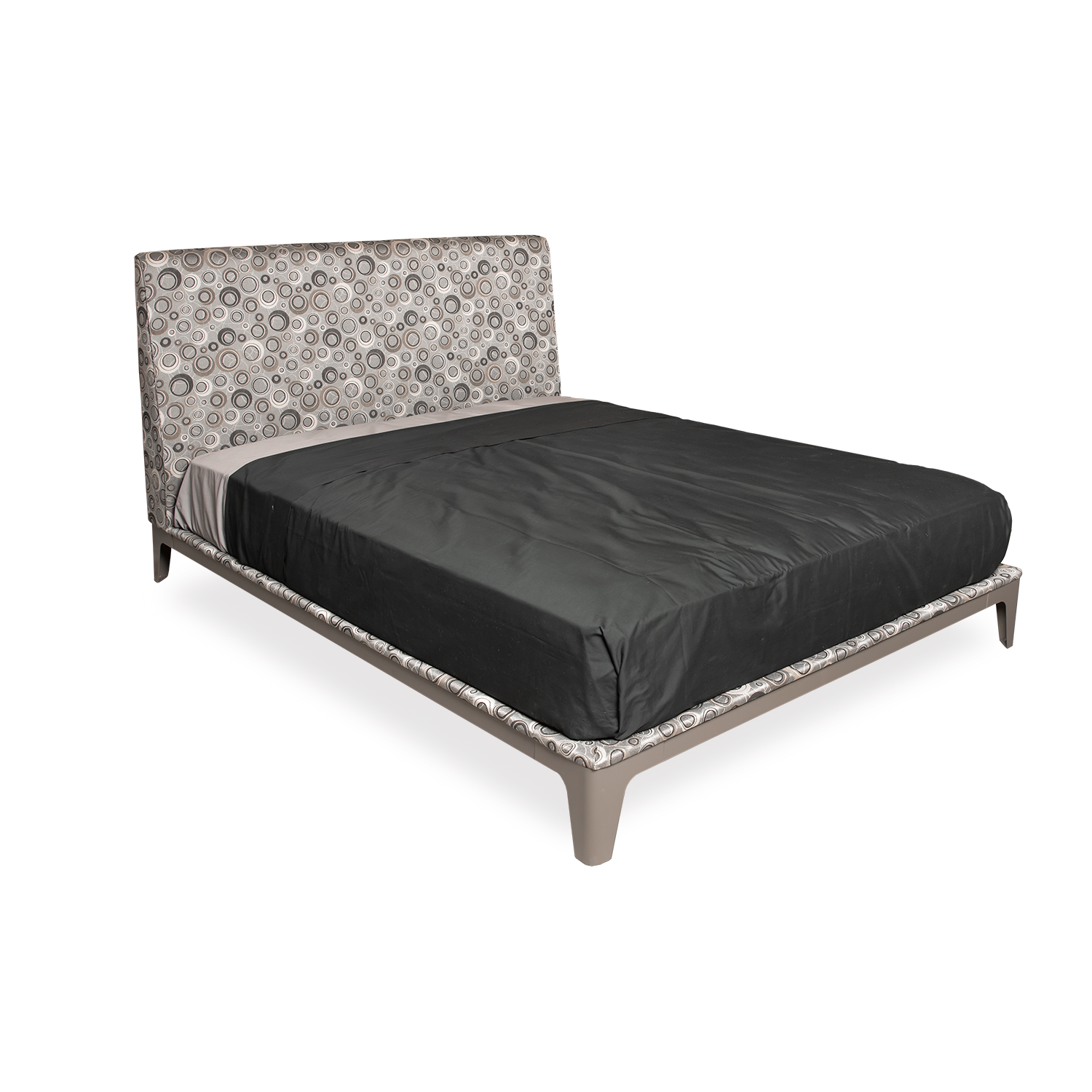 The Nuance King Bed features spaceship charocal fabric upholstery and a taupe metal frame, resulting in a cool-toned, balanced look. The thick, tapered headboard contrasts stikingly with the thin, sleek frame, and the spaceship charcoal fabric's circular pattern brings subtle tones of white, brown, and grey to your space.