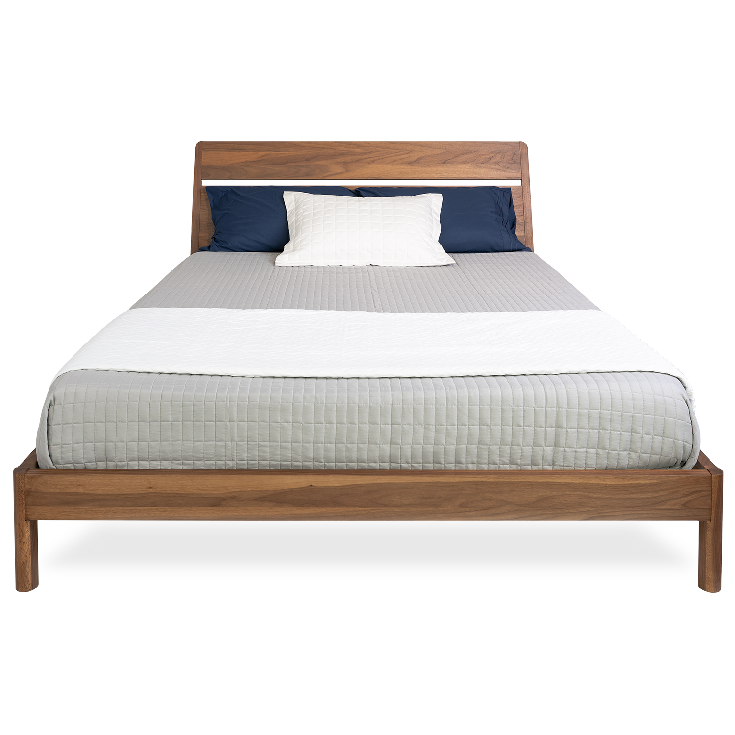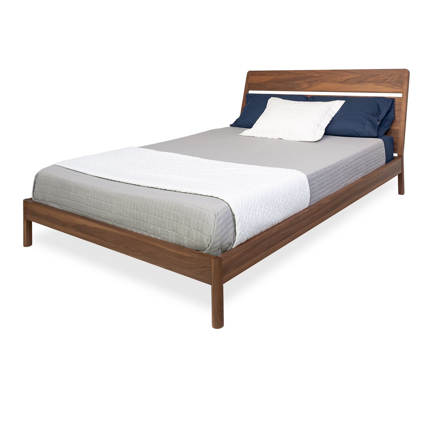 Made of wood with a smoked walnut finish, the Nueva King Bed features a clean, minimalist profile and a slatted platform base. Nueva's rounded rectangular headboard is angled back to allow for a more comfortable position when sitting upright in bed, while the horizontal gap in the wood adds a visual accent. The rounded corners and legs of the lower frame echo the lines of the headboard for a consistent look that creates an overall impression of warm simplicity and classic design.
