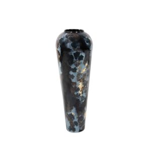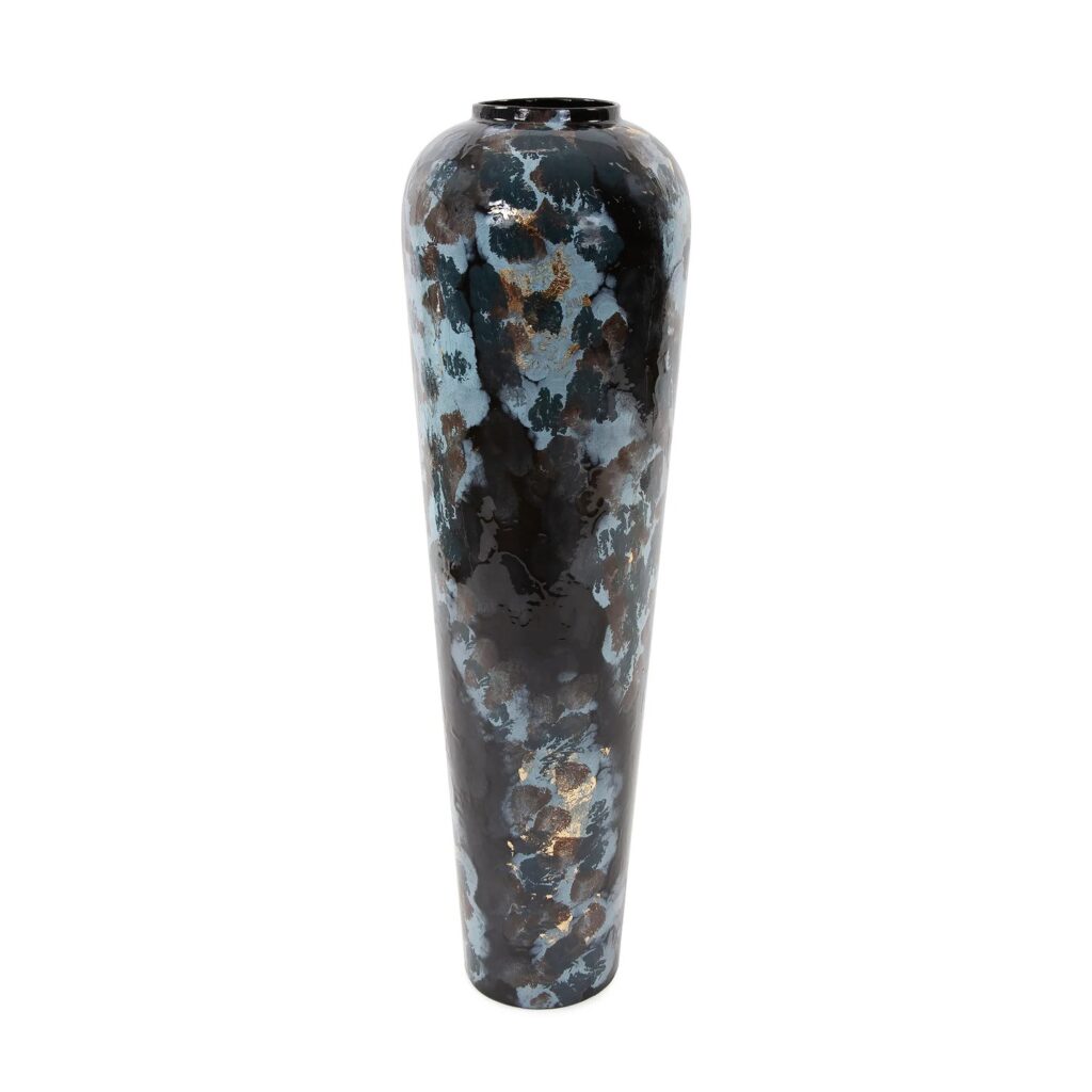 [0] => Inspired by the deep, vivid colors of the Mediterranean Sea, the Tall Ocean Beach Vase is made of iron and hand-painted with daubs and specks of dark blue, light blue, brown, and gold. This vase features an elegant torpedo shape and an oversized form that will make a dramatic statement wherever you place it.