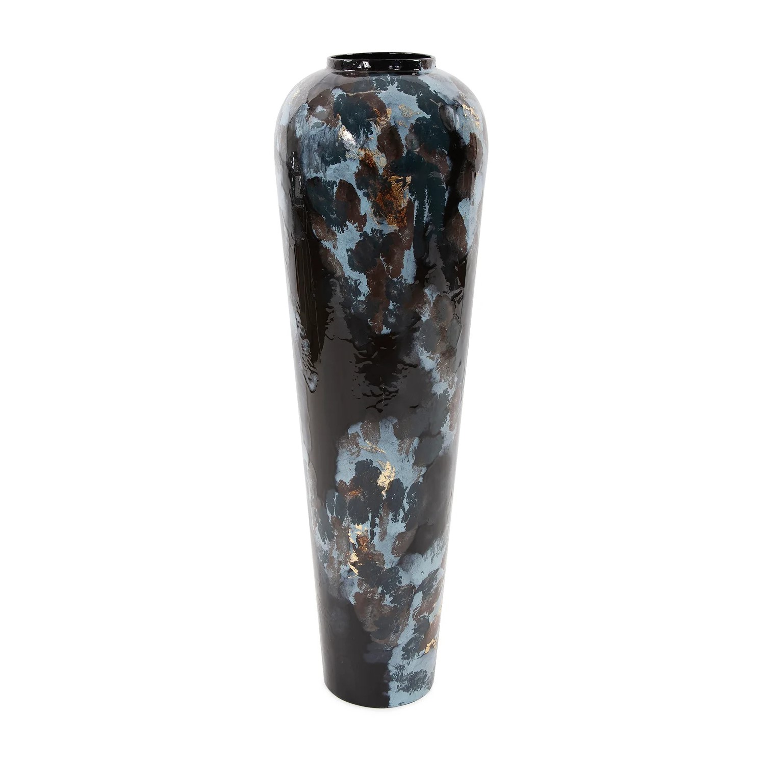 Inspired by the deep, vivid colors of the Mediterranean Sea, the Tall Ocean Beach Vase is made of iron and hand-painted with daubs and specks of dark blue, light blue, brown, and gold. This vase features an elegant torpedo shape and an oversized form that will make a dramatic statement wherever you place it.