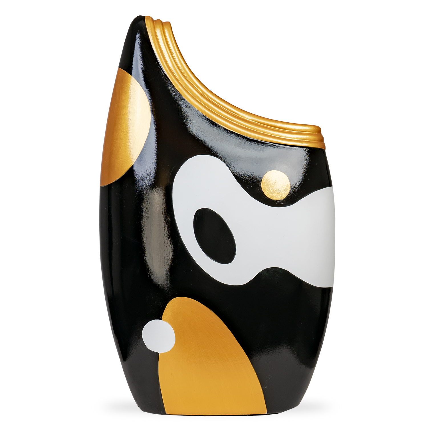 [0] => Funky, modern, and playful, the Odyssey Medium Vase catches the eye with its blend of unique forms and bold colors. This ceramic vase is painted in black, gold, and white, with a pattern of circles, blobs, and eye-like shapes. Its wide, flattened silhouette is topped by an asymmetrical opening accented with gold ridges. Display this vase on its own or pair it with its matching companions to add a pop of unabashedly modern style to your interior.