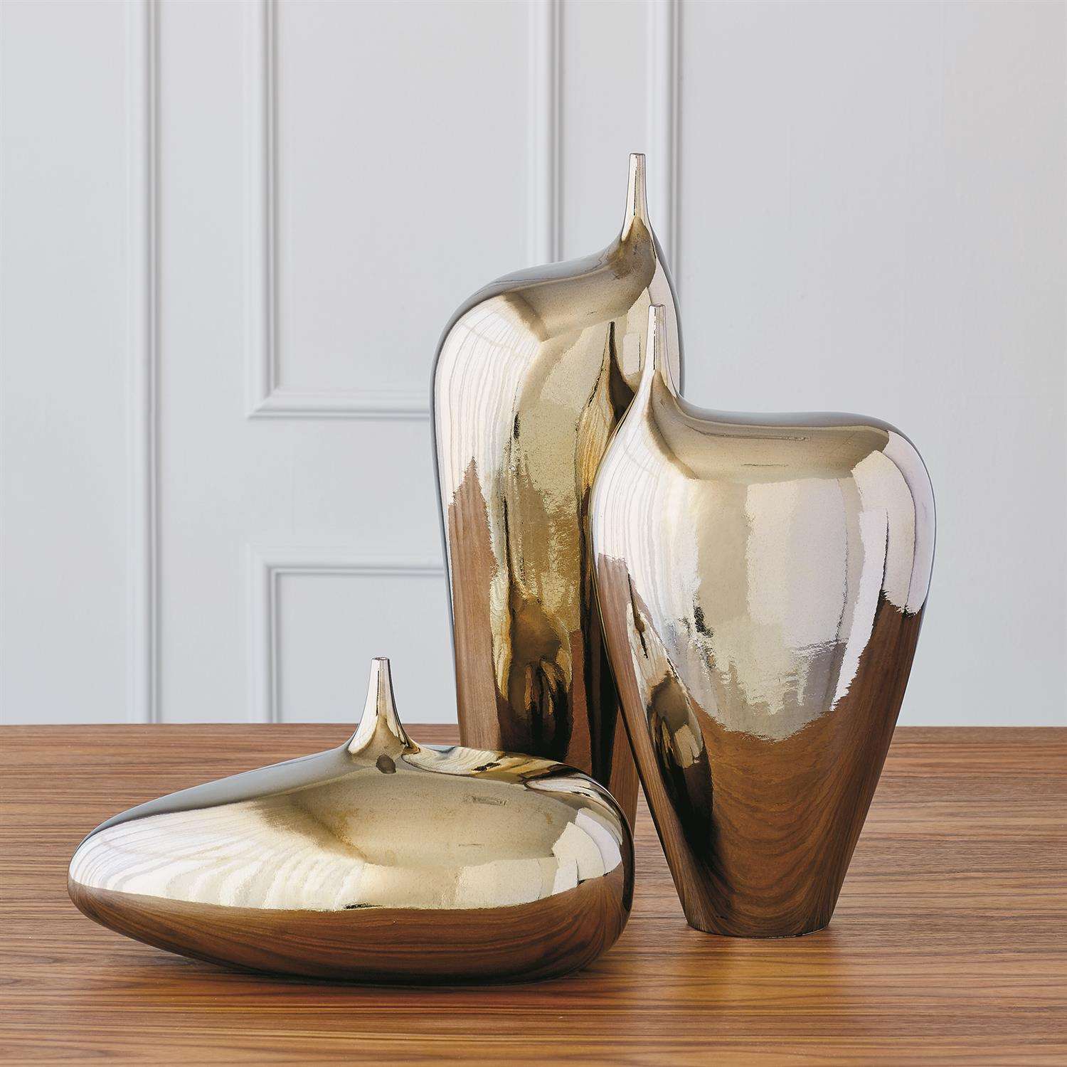 [0] => The Small Offset Neck Object has a wide, egg-shaped body that tapers to a strikingly narrow mouth, just wide enough to accommodate a single faux flower if one chooses. This one-of-a-kind silhouette is paired with a bronze crackle glaze whose reflective finish creates a warm and lustrous look. Pair with the companion Medium Offset Neck Object for a guaranteed conversation starter.