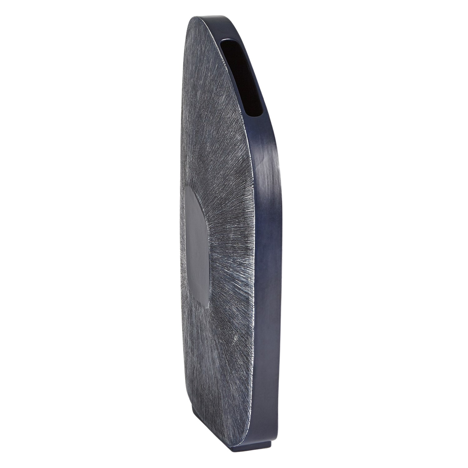 [0] => Crafted from blue Portuguese ceramic with an ink finish, the Offset Square Scratch Vase has an eye-catching striated design with narrow white lines radiating from a central blank space. This vase has a tall profile that can show off an equally daring bouquet or stand on its own as a funky accent piece for a modern interior.